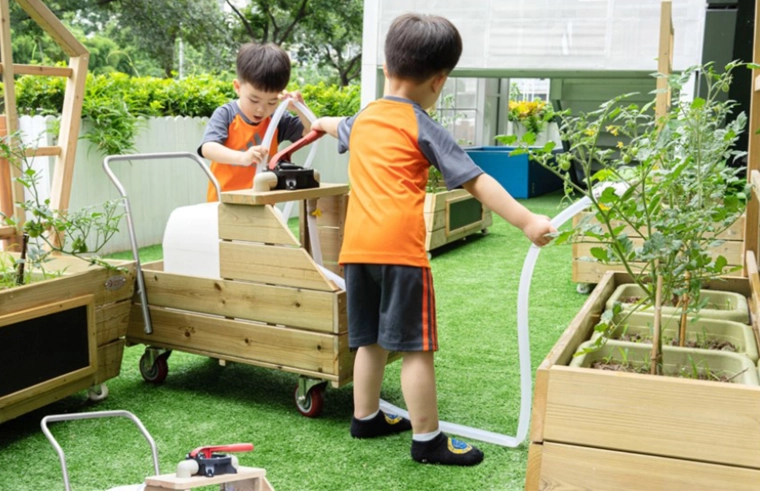 De geïntegreerde handpomp met een soepele slang laat kinderen veilig de waterstroom regelen en planten gericht bewateren.