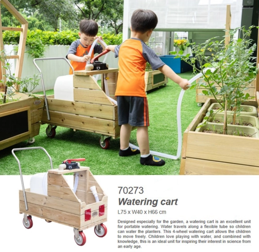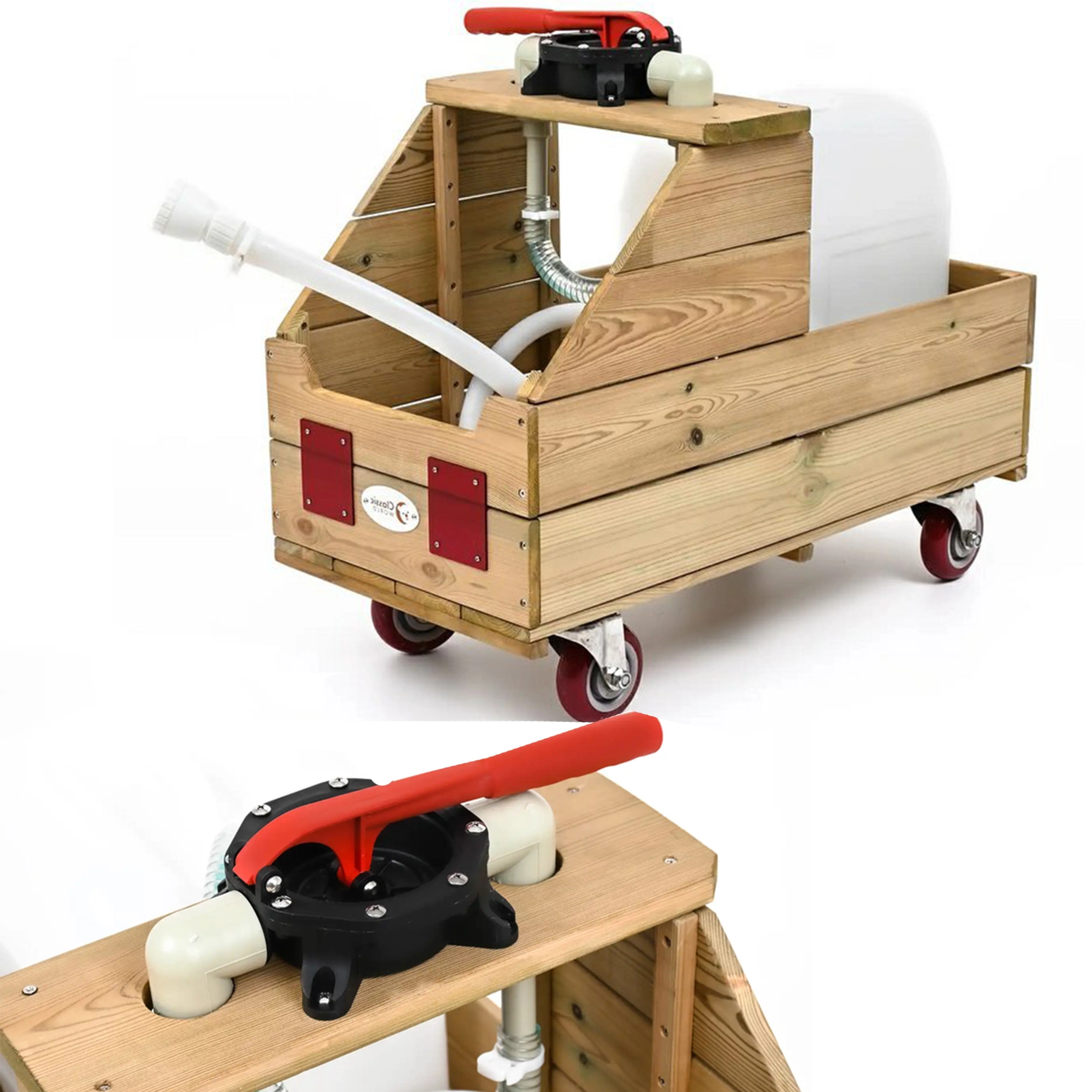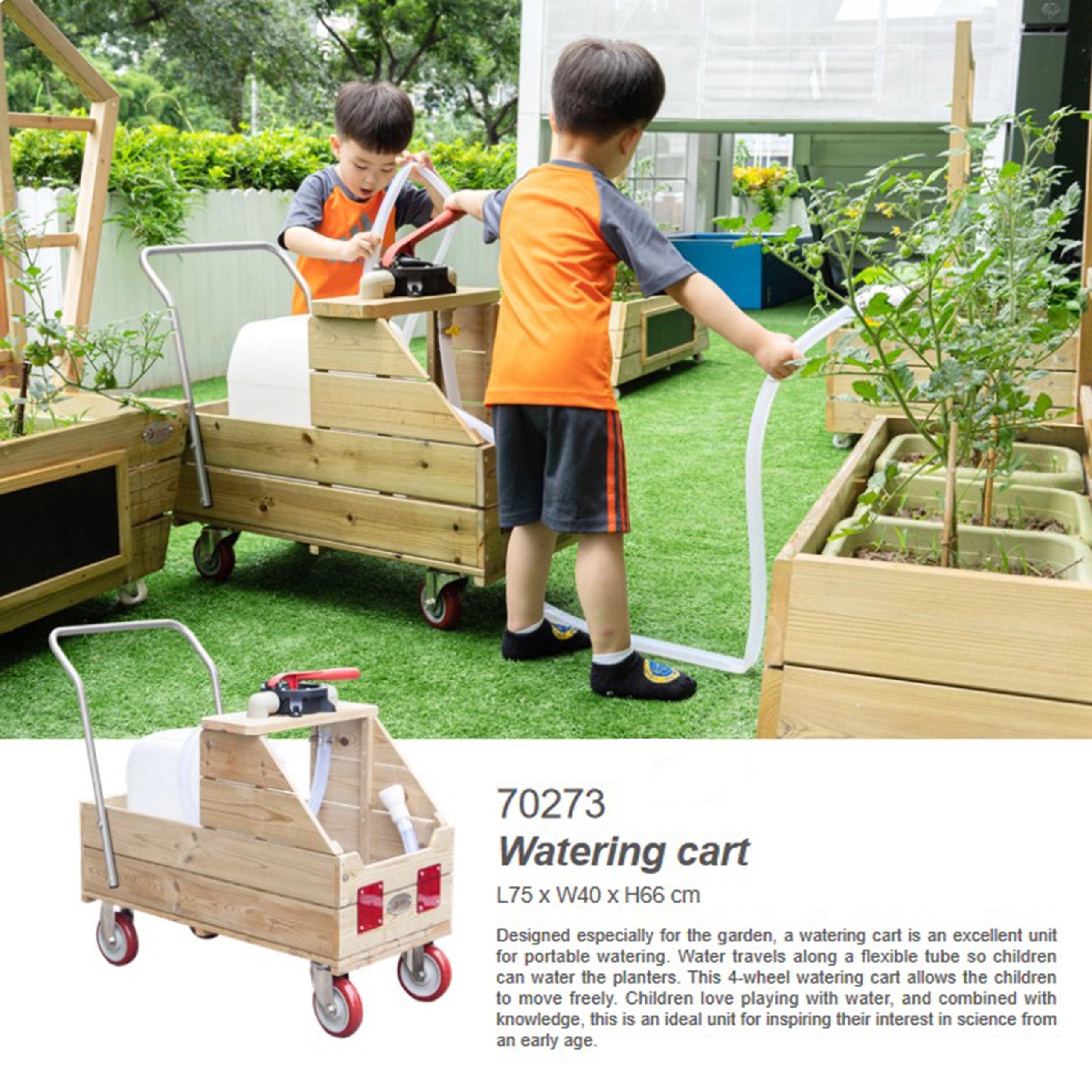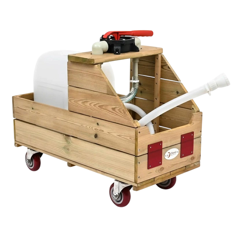 Deze hoogwaardige houten wagen is ontworpen voor het veilig en makkelijk verplaatsen van water rechtstreeks naar de planten. De geïntegreerde handpomp en soepele slang maken het voor kinderen comfortabel en nauwkeurig om zowel perken als bakken water te geven. Het stabiele frame, de soepele loop en de praktische handgreephoogte ondersteunen een natuurlijke en gezonde beweging.