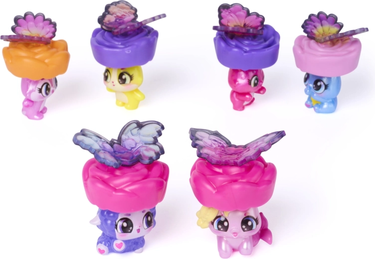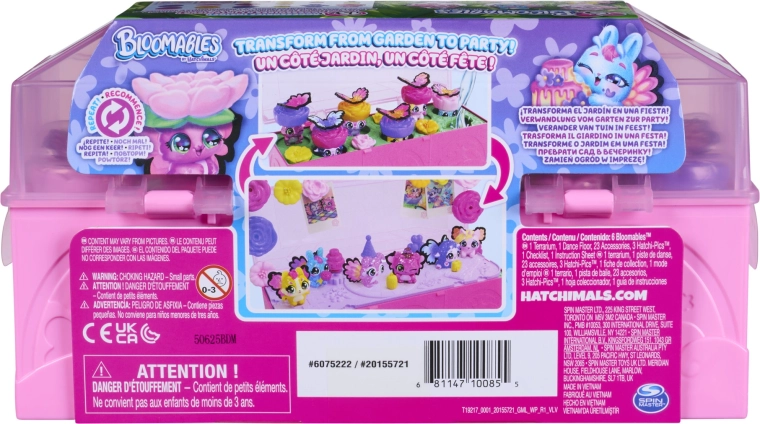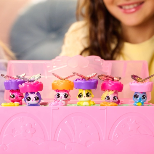 Stap in een fantasiewereld met de verzamelset Hatchimals Bloomables Bloom Bash. Giet water in het hart van de speelkoffer en de bloemen beginnen “te groeien” om verborgen figuurtjes te onthullen – van een mer‑eenhoorn tot een konijntje en een hondje. Na de onthulling verander je de koffer in een dansvloer, geef je de figuren kleurrijke vleugeltjes en versier je het deksel met Hatchi‑Pics foto’s.