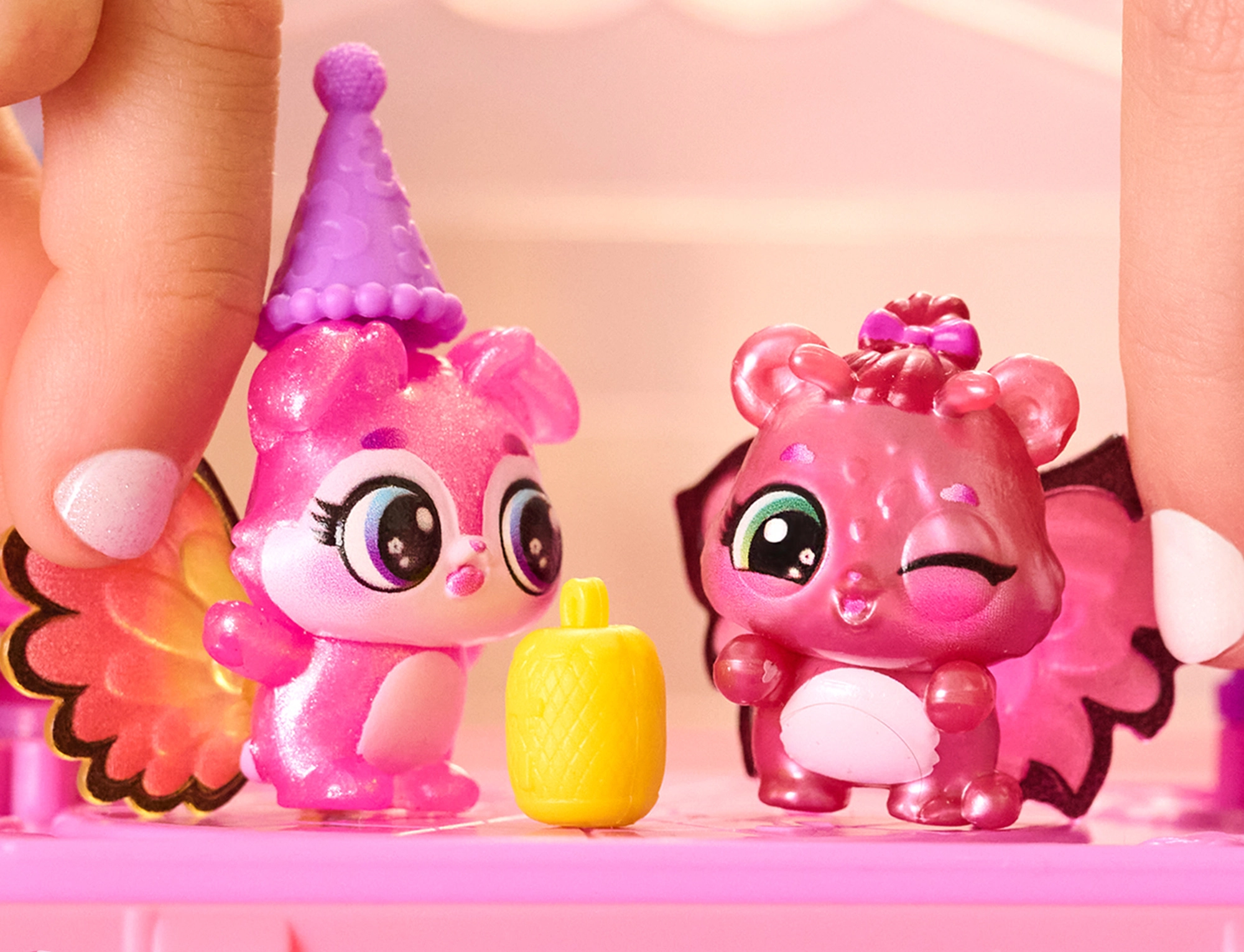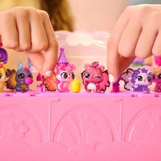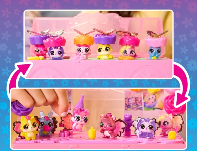 Na de onthulling verander je de set in een dansvloer, bevestig je kleurrijke vleugeltjes aan de figuren en versier je het deksel met Hatchi‑Pics foto’s. Het feest kan beginnen!
