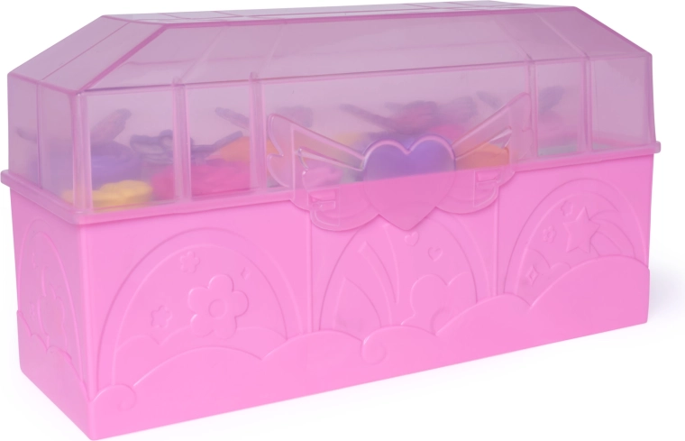 - Roze koffer met transparant deksel, vakjes voor figuren en accessoires