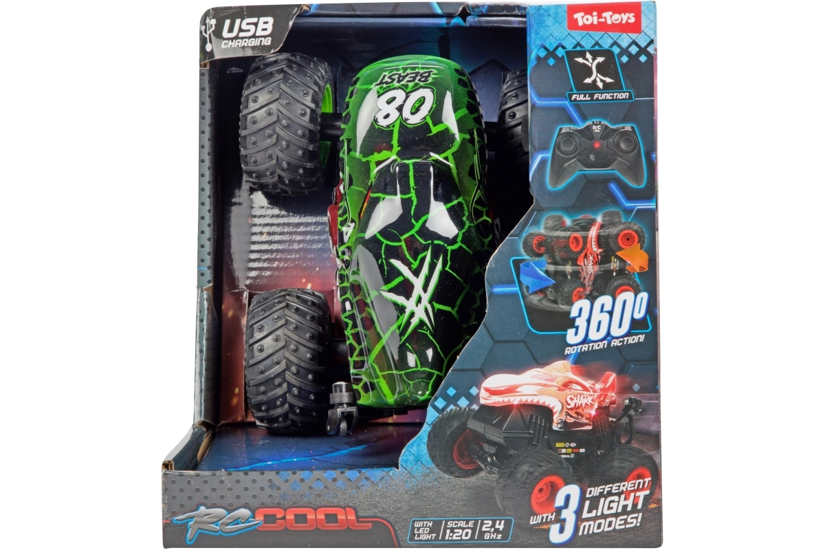 Leuke en duurzame RC monstertruck 1:20 voor kinderen vanaf 3 jaar met rijden vooruit/achteruit, links/rechts en een speciale rotatiefunctie. De auto heeft een oplaadbare batterij via USB (inbegrepen), de controller werkt op 2× AA (niet inbegrepen). Ideaal voor spelen binnen en buiten, met robuuste wielen en een kunststof constructie voor een lange levensduur.