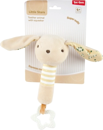 Het beige konijntje met lange oortjes en een zacht lijfje rammelt zacht, knispert en nodigt uit om te knuffelen. De lichte constructie en de stervormige bijtring zijn ideaal voor baby’s vanaf 4 maanden.