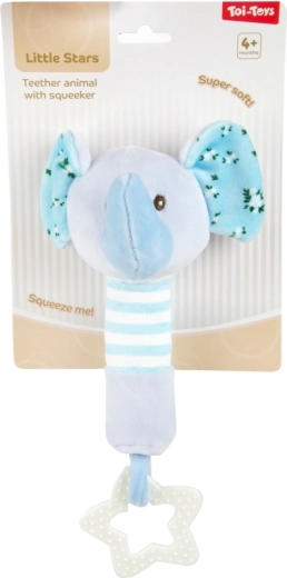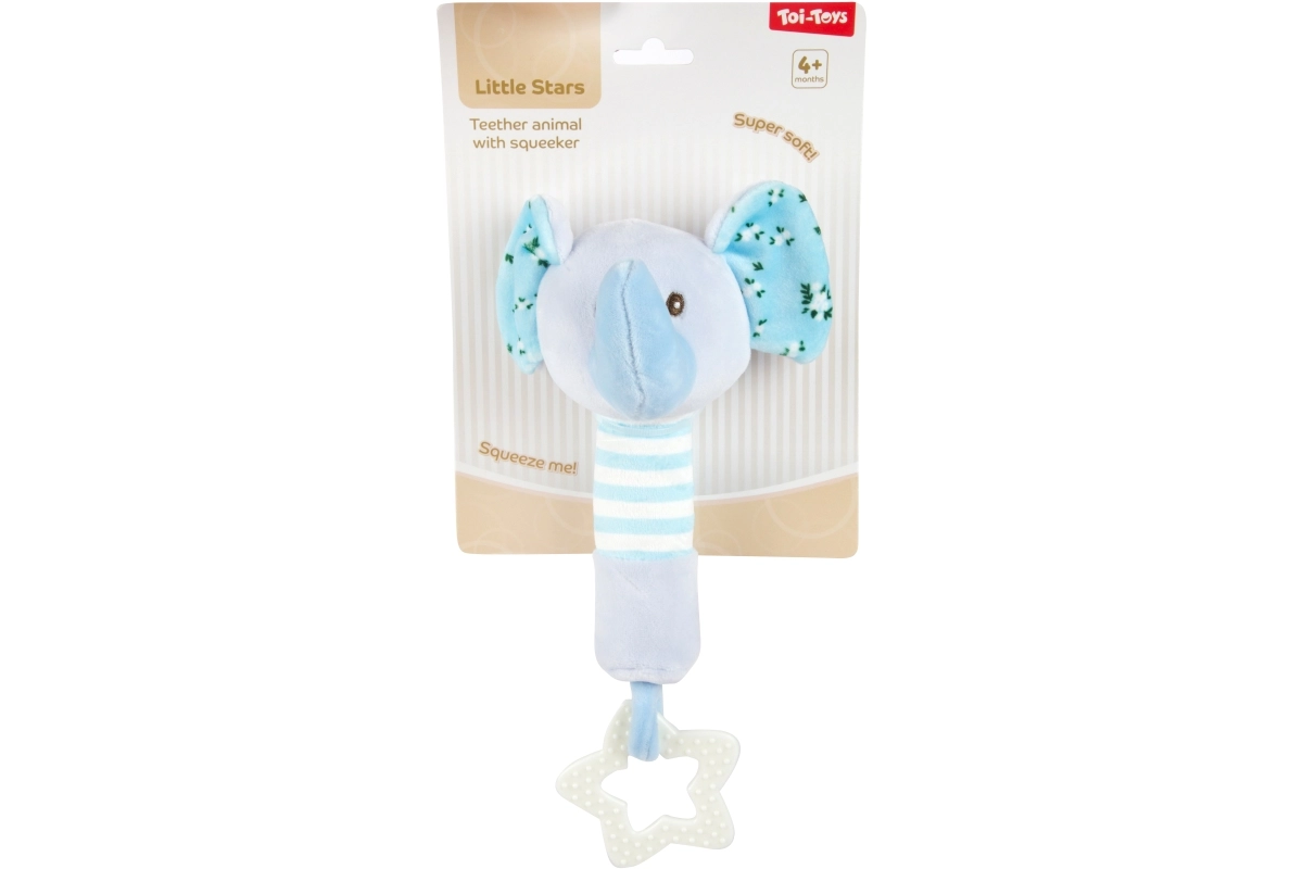 De pluchen olifant in zachtblauw heeft knisperende oortjes, een gestreepte greep en een stervormige bijtring die het tandvlees verzacht. Het geïntegreerde piepertje zorgt voor speelse interactie.