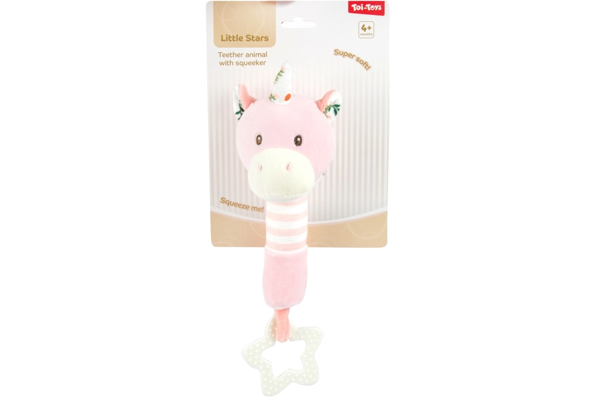 De schattige roze look met een superzacht lijfje en een piepertje spreekt elke baby aan. De stervormige bijtring biedt verlichting bij doorkomende tandjes, op elk moment van de dag.
