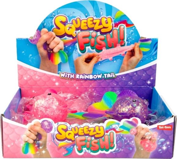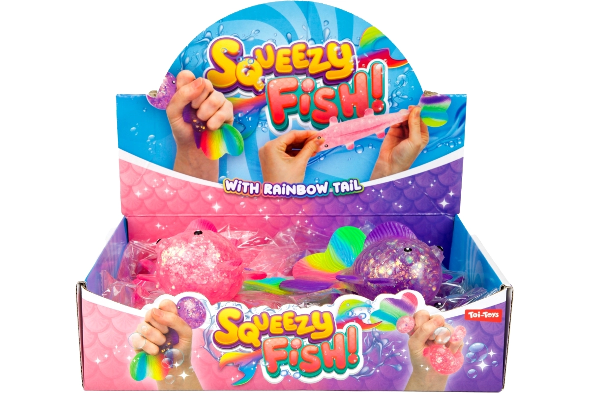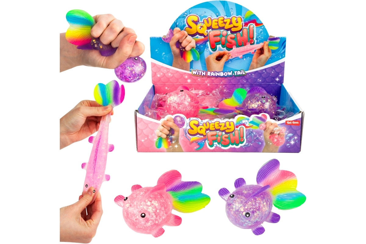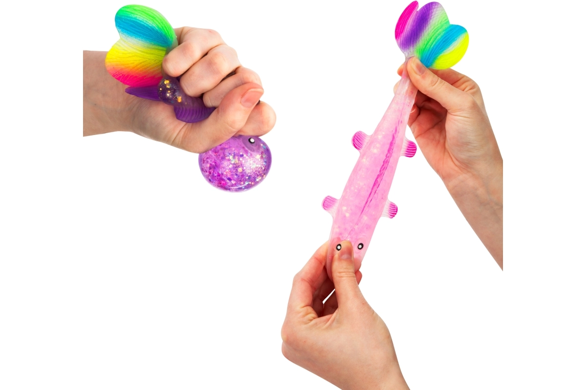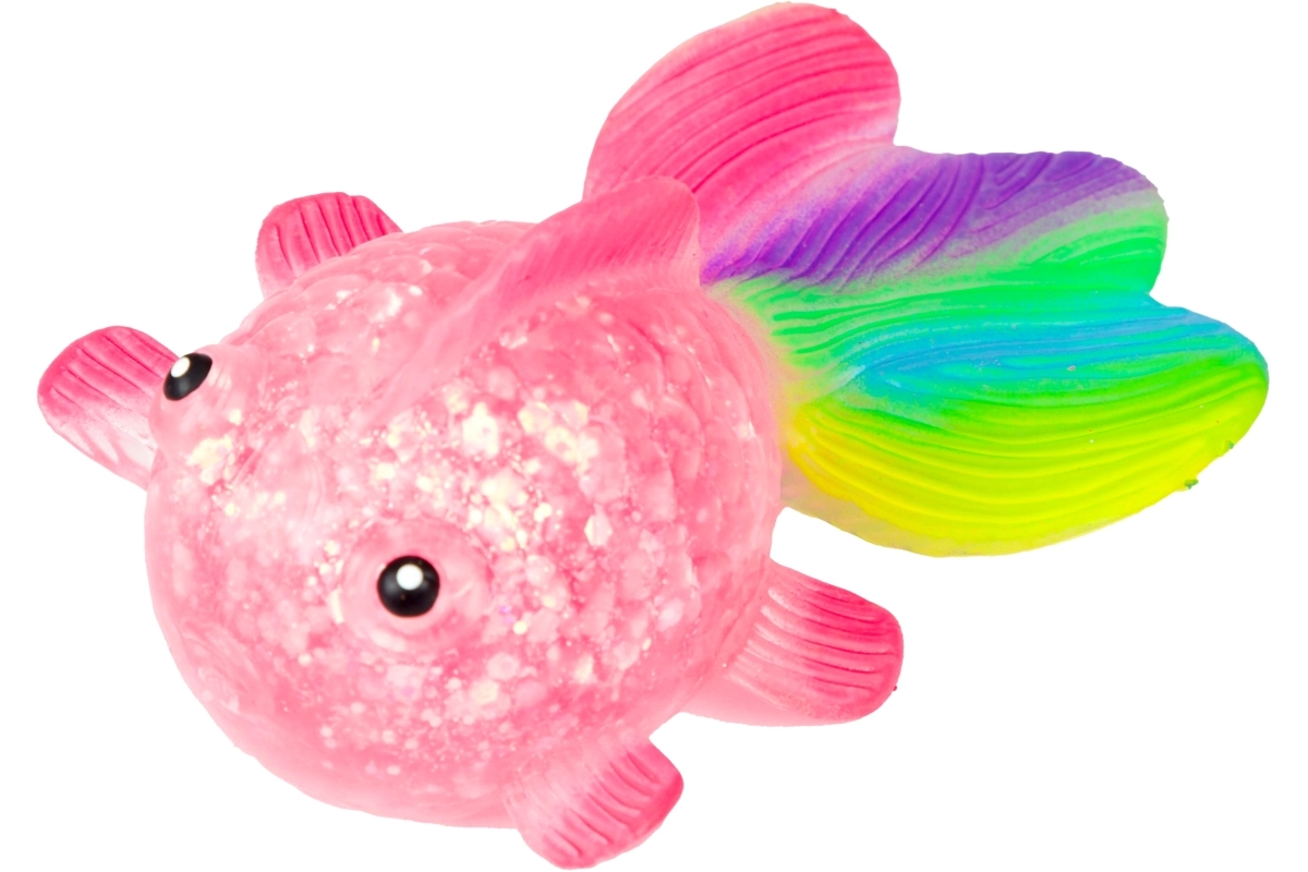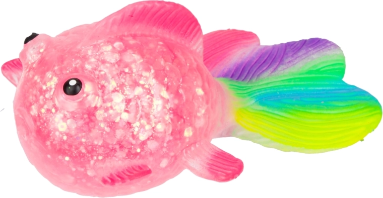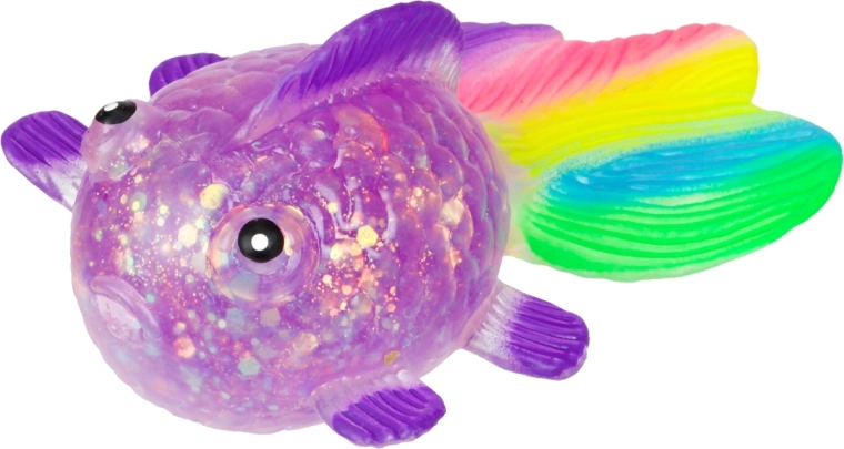 Het transparante lichaam met glitters en de kleurrijke staartvin spreken zowel kinderen als volwassenen aan en nodigen uit om nóg meer te knijpen.