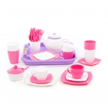 - Set bevat: dienblad, 4 kopjes, 4 onderzetters, 5 bekers, suikerpot, 4 borden, 4 theelepels, 4 vorken, 4 messen, theekan
