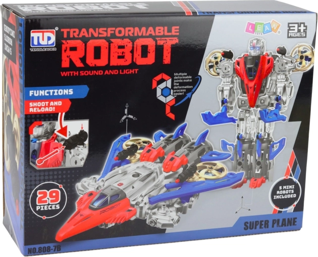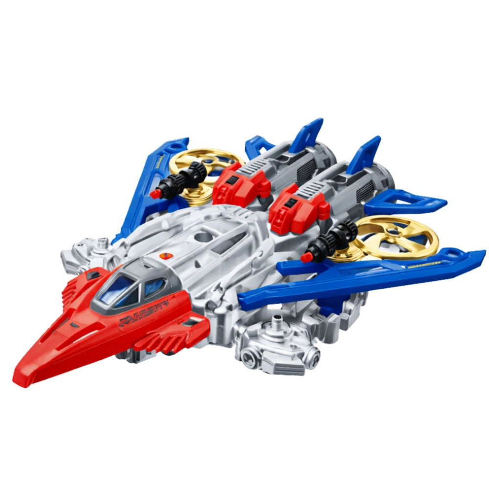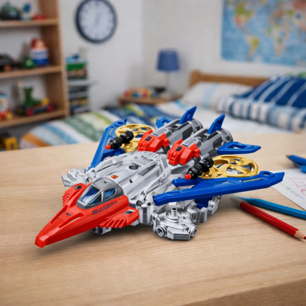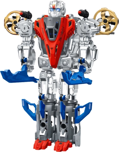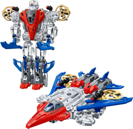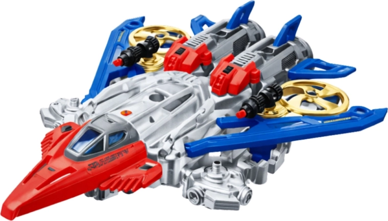 Dit gedetailleerd uitgewerkte model in een combinatie van zilver, rood en blauw biedt twee speelvormen: een gevechtsrobot met opvallende turbines op de schouders en een aerodynamische straaljager met verbrede vleugels. Geïntegreerde lichten en geluiden trekken kinderen het verhaal in en veranderen elke vlucht of strijd in een spannend avontuur.