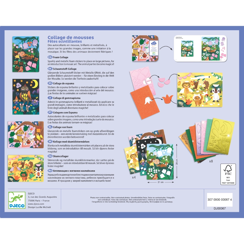Deze originele schuimcollage “Glanzende feestjes” geeft kinderen plezier in knutselen zonder rommel. Voorbedrukte kartonnen achtergronden met schattige dieren worden afgewerkt met kleurrijke, vaak glinsterende, schuimvormen. Kinderen halen de voorgeponste stukjes eenvoudig los en plakken ze volgens de instructies of hun eigen fantasie.