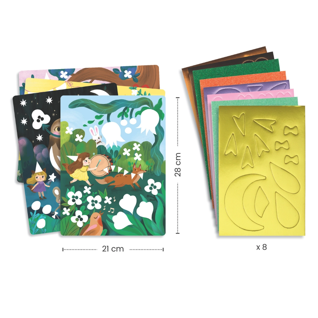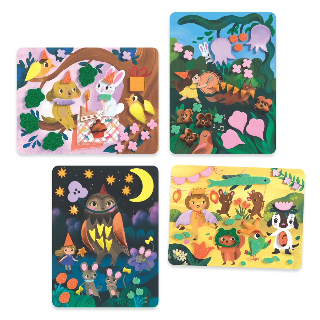 Dankzij zelfklevende schuimvormen met een glanzend oppervlak maken kinderen eenvoudig sprankelende kunstwerkjes met dieren op een feestje. Geen rommel, gewoon lospeuteren en plakken.