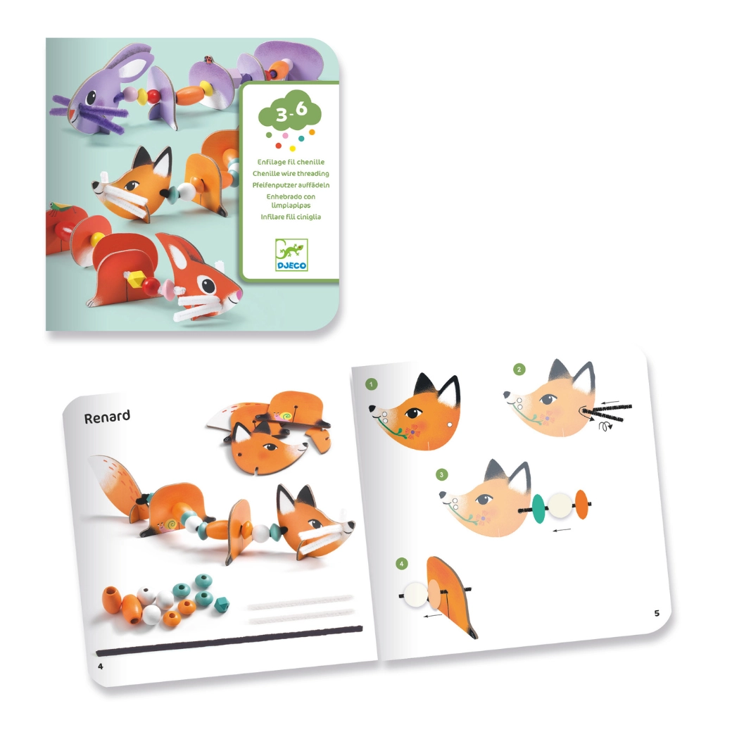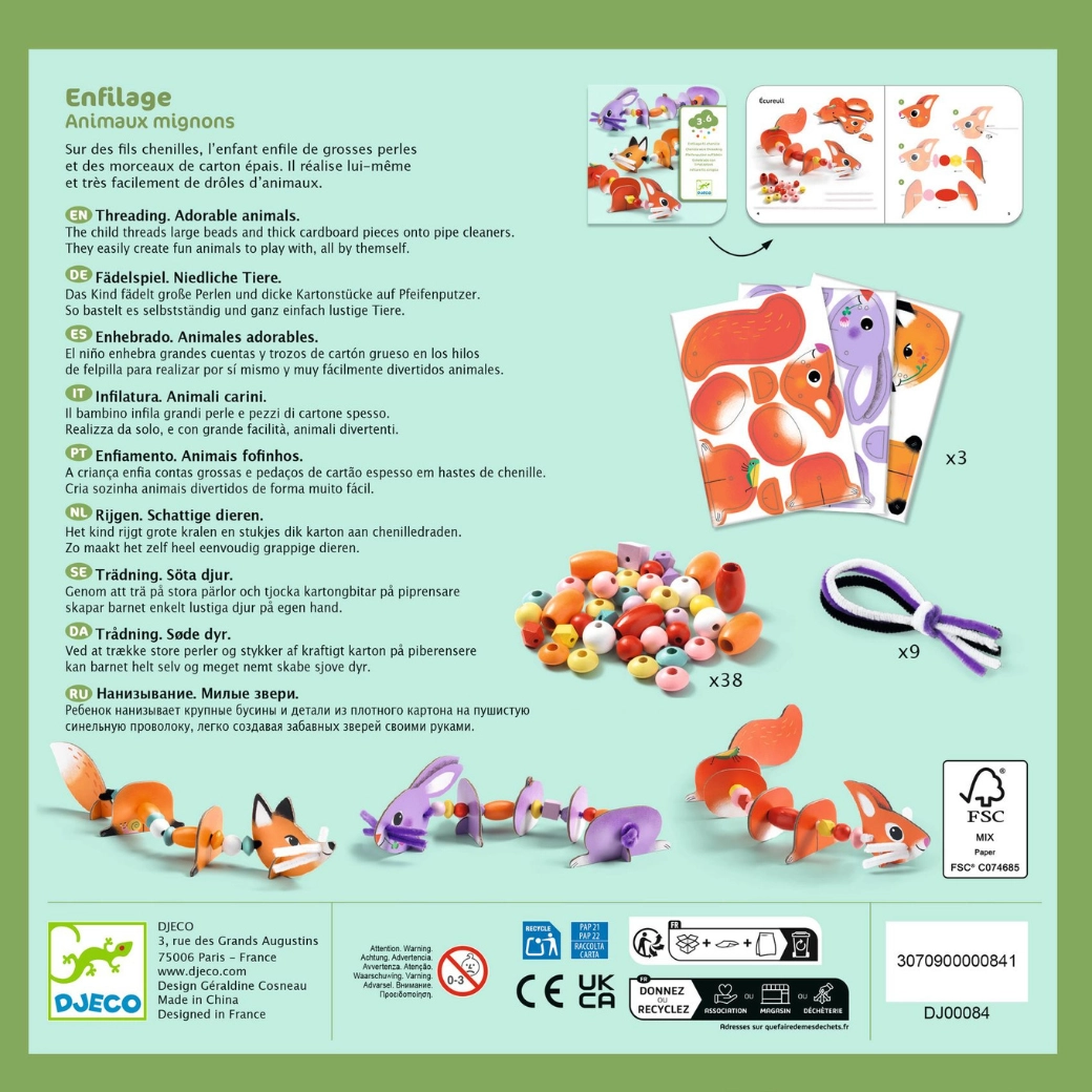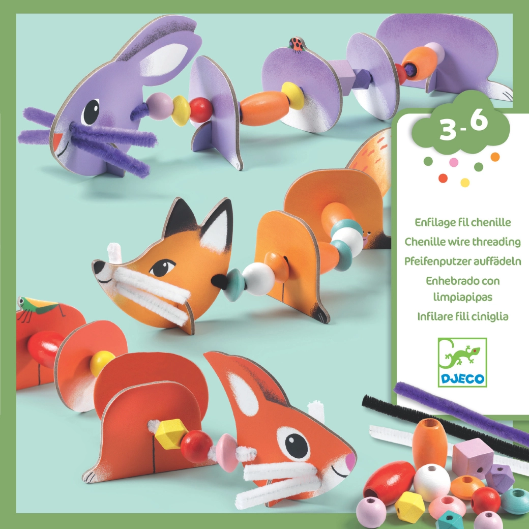Deze kleurrijke set van DJECO maakt van rijgen een boeiend spel. Kinderen zetten uit stevig geïllustreerde onderdelen een vos, een konijntje en andere dieren in elkaar, die ze verbinden met koorden en kralen. Dankzij de segmenten bewegen de figuurtjes mooi en oefenen kinderen geduld en logisch ordenen.