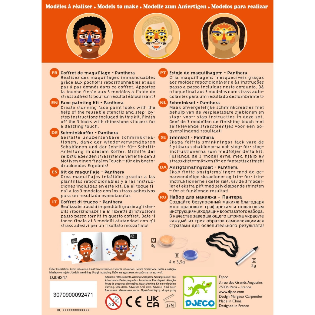Ontdek de leuke gezichtsschminkset met junglethema van DJECO. Verander jezelf in een tijger, jachtluipaard of leeuw dankzij de heldere, intense kleuren, handige sjablonen en eenvoudige applicators. Ideaal voor kinderfeestjes, carnavals en creatief spel.