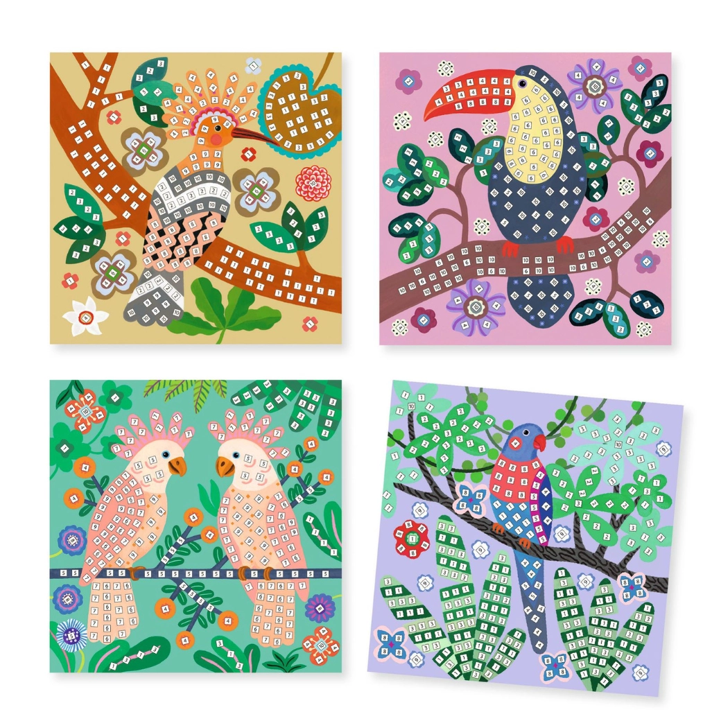 Deze creatieve set van Djeco biedt een eerste kennismaking met de wereld van mozaïeken. Kinderen plakken kleine zelfklevende tegeltjes op voorbedrukte kartonnen ondergronden volgens genummerde en gekleurde symbolen en onthullen zo stap voor stap kleurrijke scènes met vogels op een tak. De voltooide afbeeldingen komen prachtig tot hun recht in de kinderkamer en kinderen mogen er met recht trots op zijn.