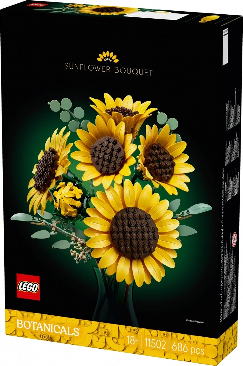 Breng een zonnige sfeer in huis met het zonnebloemboeket uit de LEGO Botanicals-collectie. Je bouwt een knop, drie bloemen in volle groei en twee volledig geopende bloemen, aangevuld met vier eucalyptusstelen. Dankzij doordachte bouwelementen hebben de bloemen natuurgetrouwe bloemblaadjes en getextureerde harten, terwijl stelen en bladeren eenvoudig te positioneren zijn voor de perfecte compositie in een vaas.