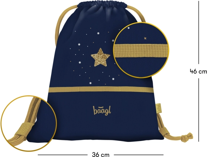 Stijlvolle BAAGL-zak in Unicorn Gold-design, ideaal voor schoenen en kleine spullen in je vrije tijd. Biedt een stevig, afwasbaar materiaal, sluiting met koorden om op de rug te dragen en een praktische karabijnhaak om aan de schooltas te bevestigen.
