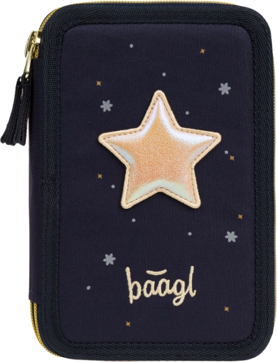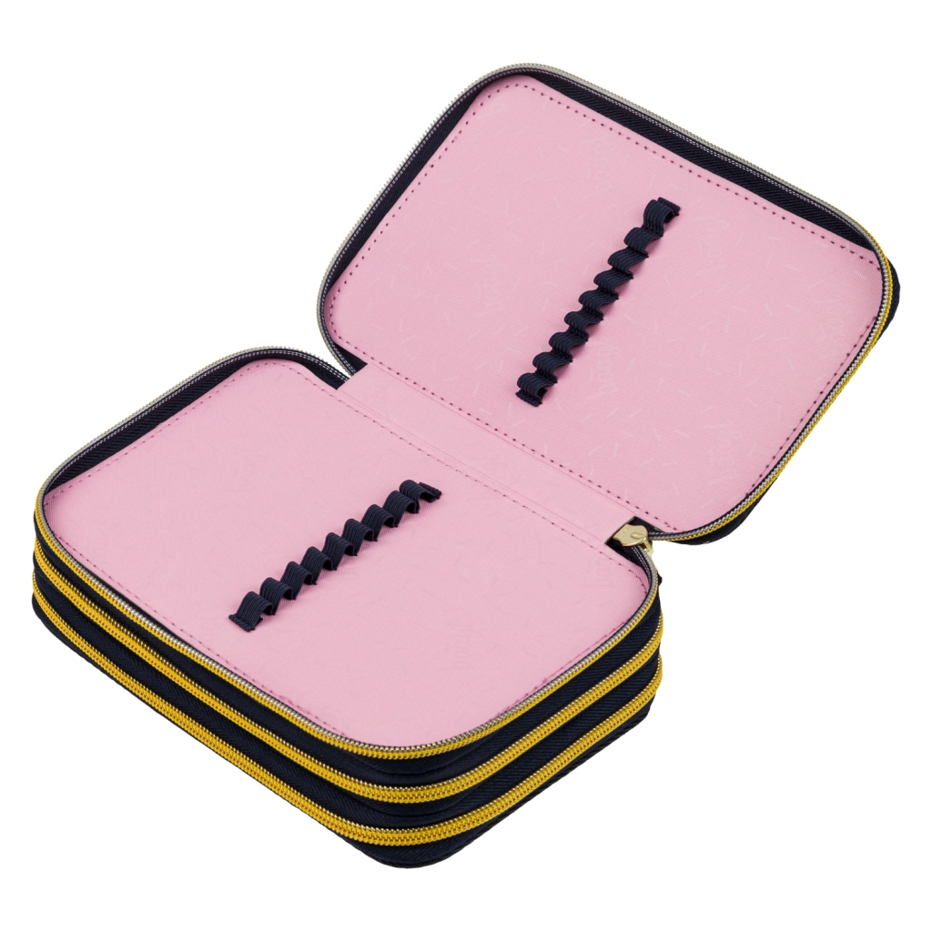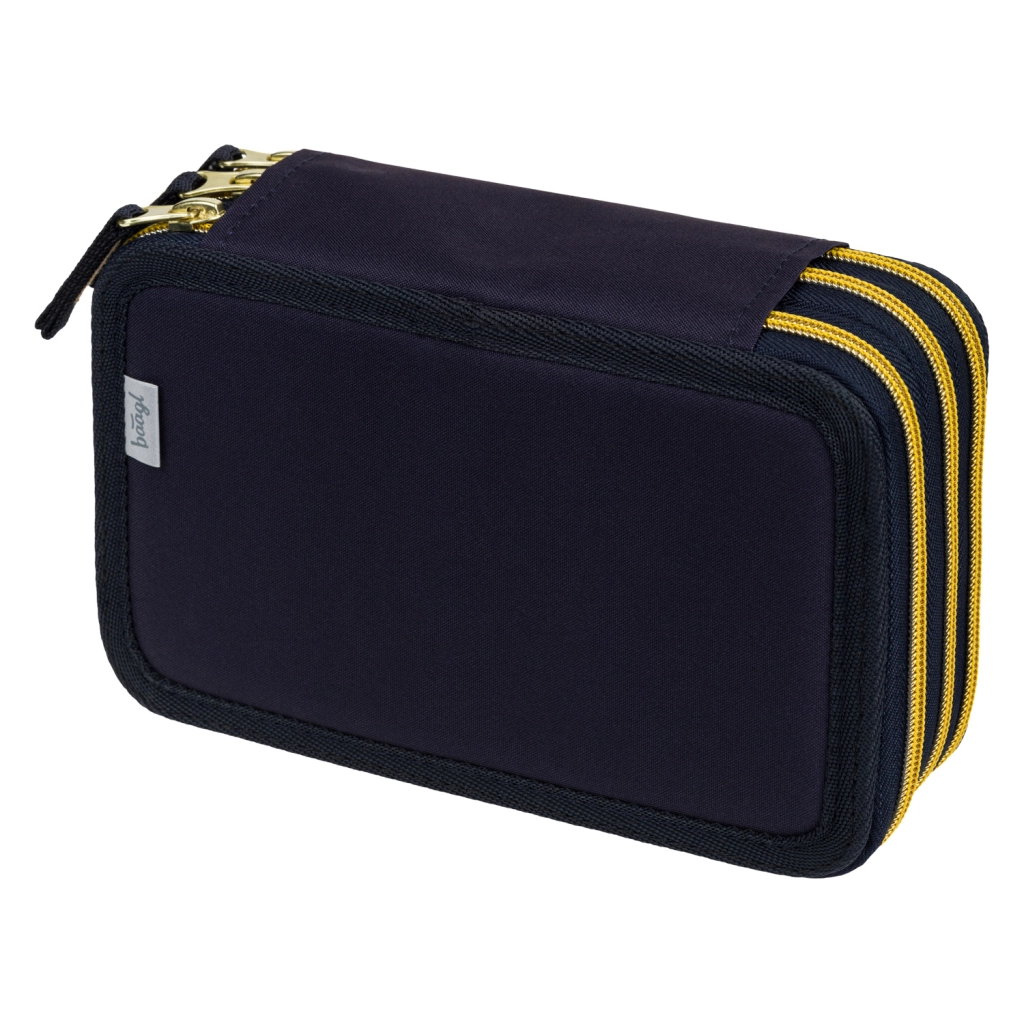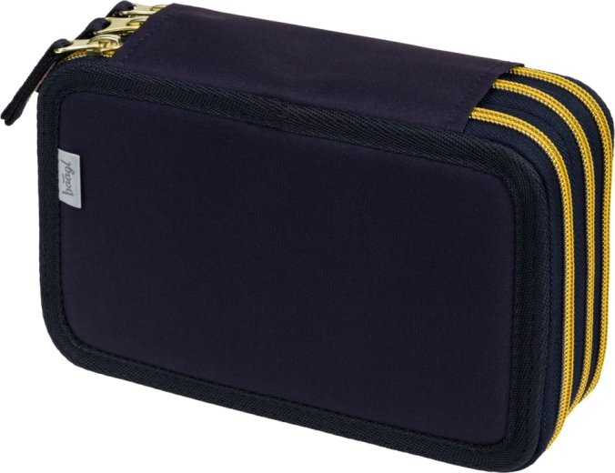Praktische driedubbele etui BAAGL Unicorn Gold in donkerblauw met opvallende details biedt doordachte organisatie van schoolspullen. Drie afzonderlijke ritscompartimenten zorgen voor snelle toegang en orde, terwijl de verstevigde rug het sluiten ook bij volle belading vergemakkelijkt.