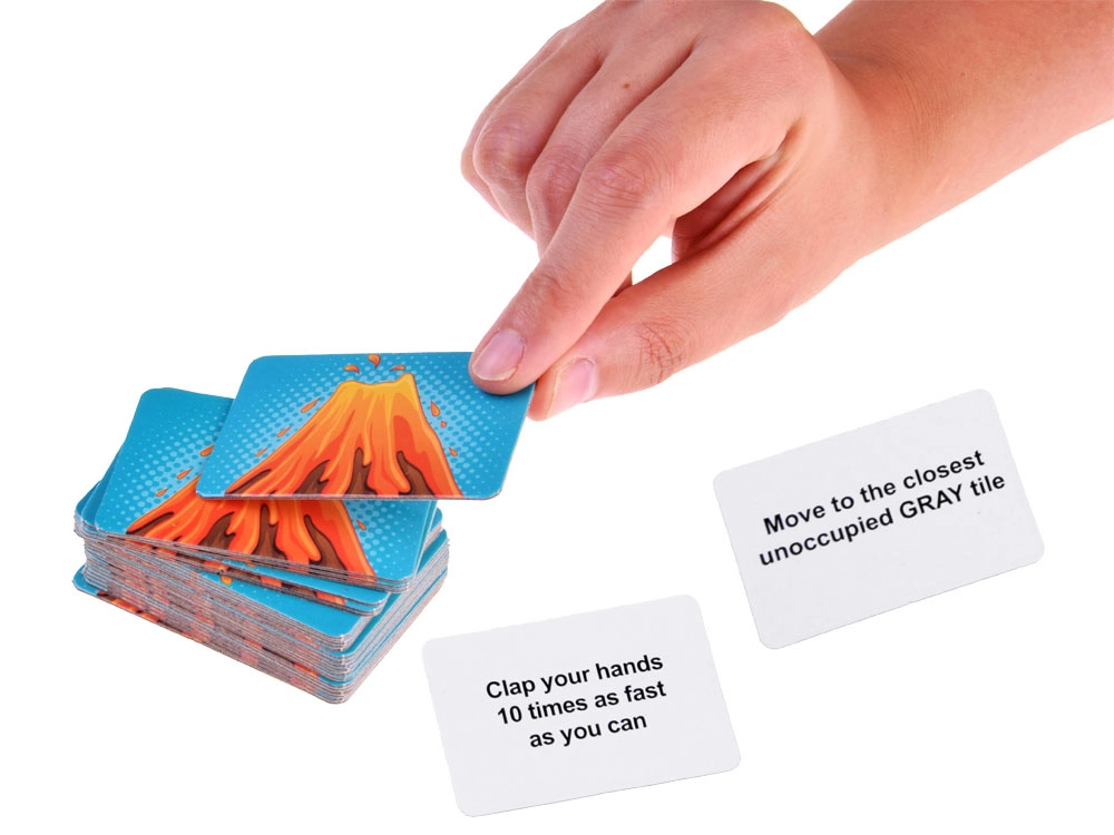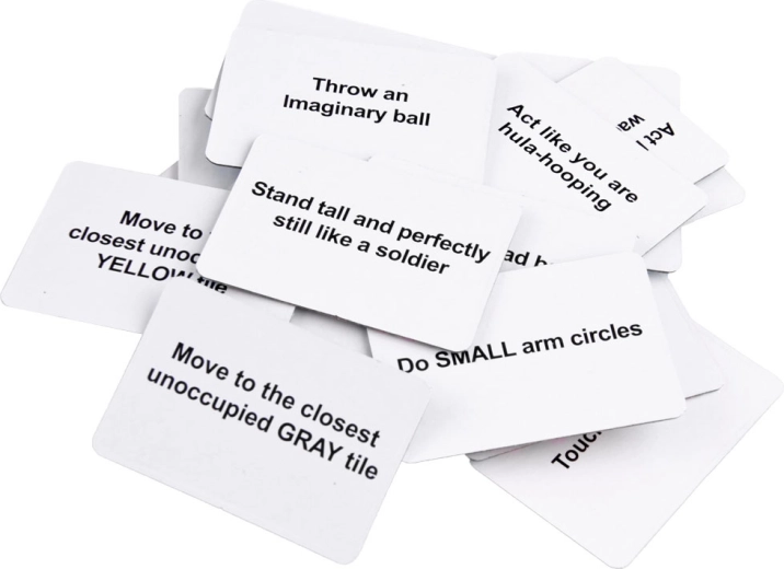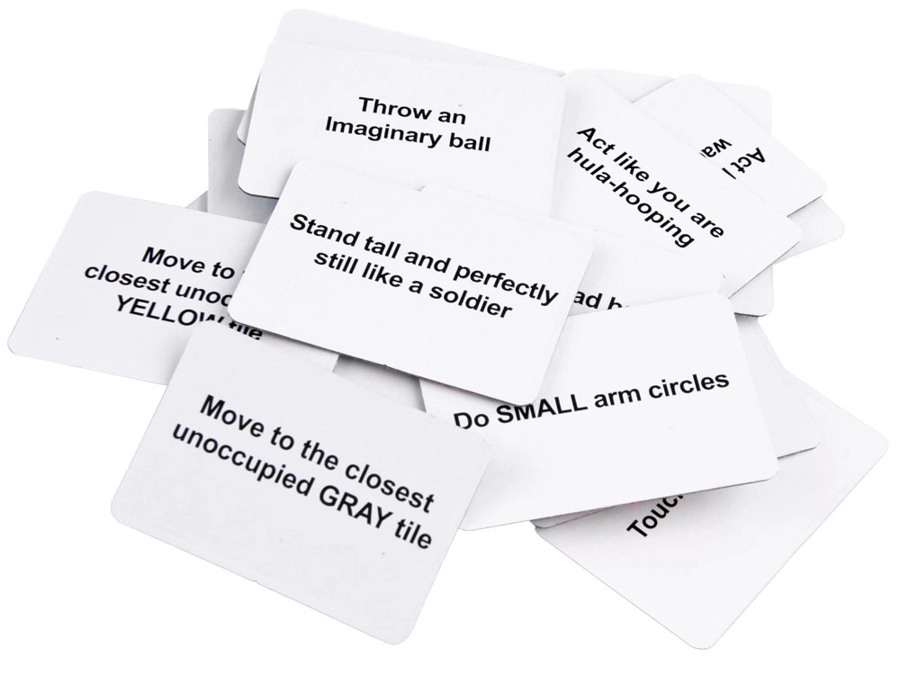 27 overzichtelijke kaarten in het Engels met korte instructies voegen actie toe: spring, balanceer, verplaats je naar de dichtstbijzijnde kleur en meer.