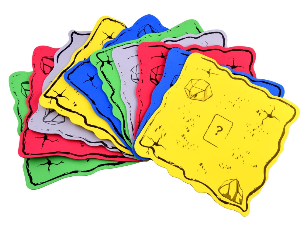 - 1× draaischijf, 27× opdrachtkaart, 20× foamtegel (10 groot, 5 middel, 5 klein)