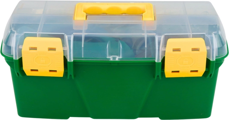 Het transparante deksel, stevige sluitingen en handvat zorgen voor eenvoudig meenemen en overzichtelijke opslag van alle tools op één plek.