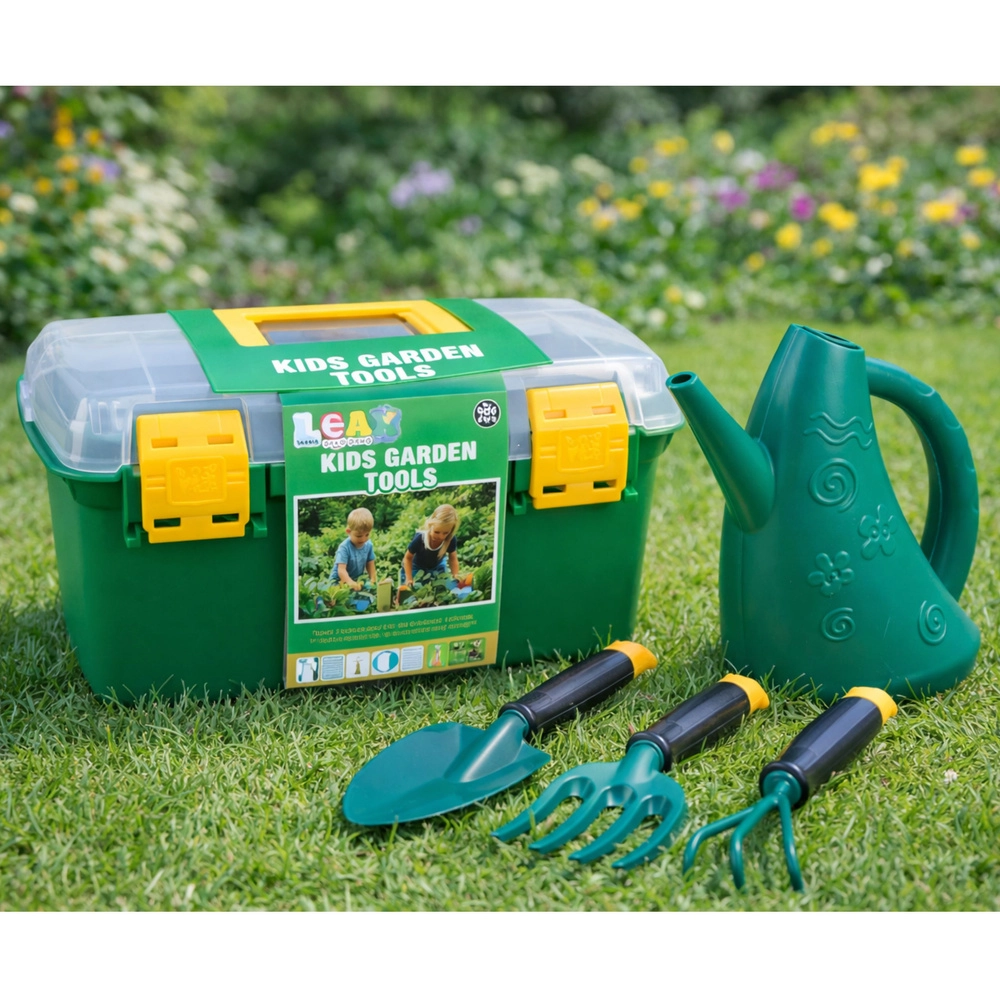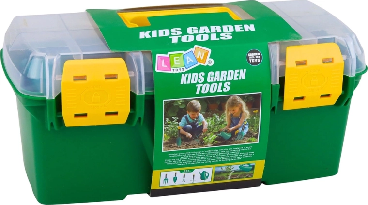 De praktische koffer met sluiting houdt alle onderdelen bij elkaar en leert kinderen netjes op te ruimen. De set is perfect als cadeau voor kleine tuiniers en ideaal voor spelen in de tuin, op het erf en in de zandbak.