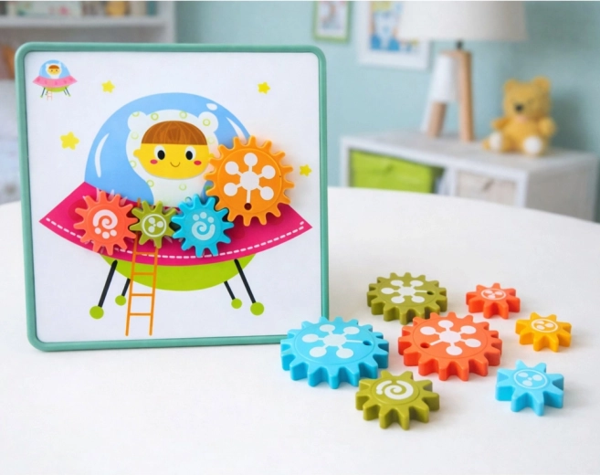 Ontdek een leuke en leerzame game voor kleine ingenieurs! Deze creatieve mozaïek met tandwielen stimuleert de fijne motoriek, het logisch denken en het begrip van oorzaak en gevolg. Kinderen plaatsen kleurrijke tandwielen op geïllustreerde ondergronden, verbinden ze en brengen met één draai het hele geheel in beweging.