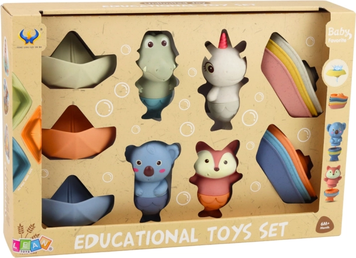 Kleurrijke set badspeeltjes maakt van elk badmoment een leuk avontuur. Bevat 13 stuks: deelbare rubberen diertjes, kunststof bootjes en rubberen sloepjes die op het water drijven en bij indrukken spuiten. Zacht, veilig materiaal en de mogelijkheid om delen te verbinden stimuleren fijne motoriek, oog-handcoördinatie en sensorische ontwikkeling.