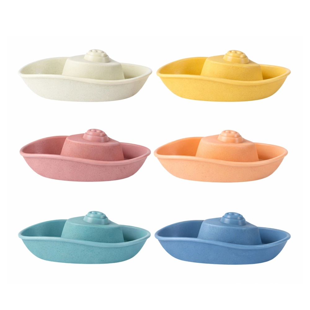 Zes lichte kunststof bootjes in zachte kleuren drijven stabiel op het water en zijn ideaal om te schenken, diertjes te vervoeren en voor fantasierijk spel.