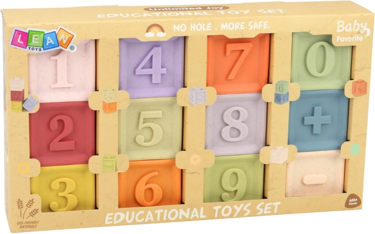 Sensorische rubberen blokken zijn een uitstekende keuze voor eerste leerervaringen via spel. Dankzij het zachte, veerkrachtige materiaal zijn ze veilig voor jonge kinderen en ondersteunen ze hand-oogcoördinatie, de ontwikkeling van de tastzin en logisch denken. Verhoogde cijfers 0–9 en wiskundige symbolen (plus, min) helpen bij de eerste rekenoefeningen, terwijl verschillende texturen en reliëfs aanzetten tot ontdekkend voelen.