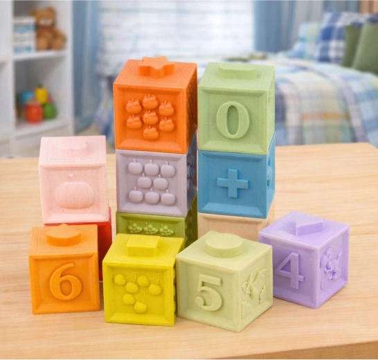 De zachte, elastische rubberen stof maakt het mogelijk de blokken te knijpen, veilig te stapelen en comfortabel vast te houden. Het formaat 5 × 5 cm is ideaal voor kleine kinderhanden.