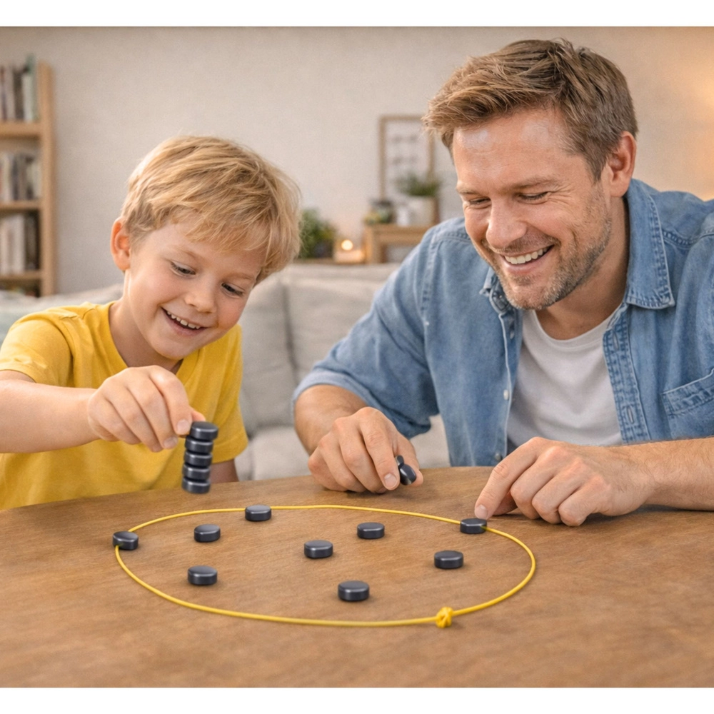Dit magnetische gezelschapsspel is ideaal voor familie-avonden en snelle duels. Elke speler krijgt hetzelfde aantal magnetische stenen en legt ze om de beurt in het gemarkeerde veld. Als stenen tijdens je beurt aan elkaar klikken, moet je alle verbonden stenen terugnemen – eenvoudige regels, maar de spanning stijgt met elke zet.