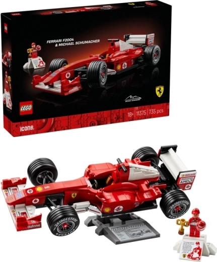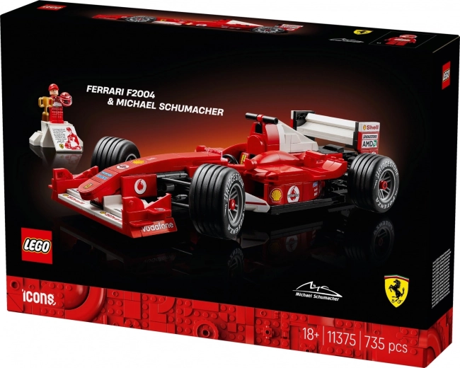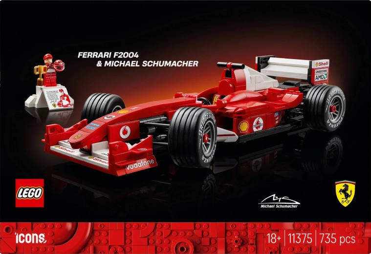 Vier het gouden tijdperk van de Formule 1 met de LEGO Icons Ferrari F2004 en coureur Michael Schumacher. Deze gedetailleerde replica van de legendarische eenzitter biedt functionele besturing, een realistische cockpit, een V10-motor en gedrukte statistieken op de displaystandaard. Inclusief minifiguur van Michael Schumacher met helm, trofee en een podium met citaat – een ideaal cadeau voor fans van F1 en verzamelaars.