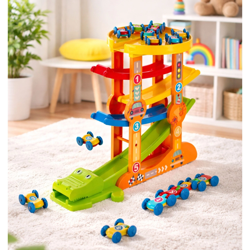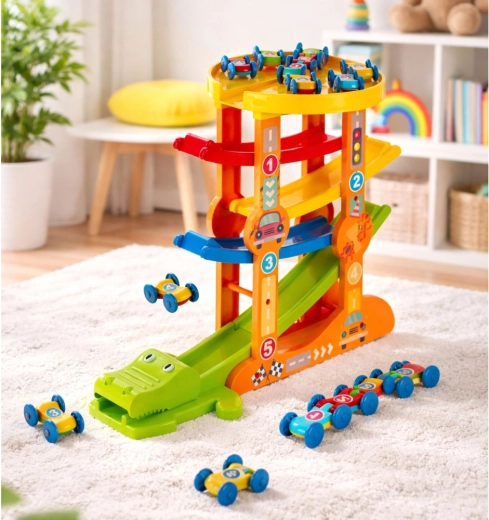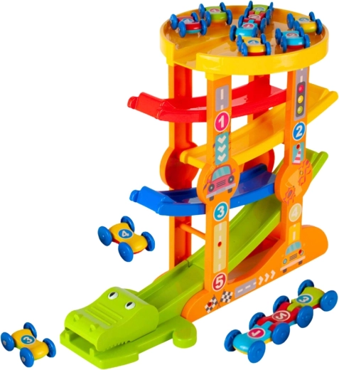 Deze originele autobaan in krokodilvorm verandert elke afdaling in een spannende rit met een spectaculair finale. De autootjes zoeven over 5 verdiepingen, versnellen in de bochten en worden aan het eind begroet door een katapult met een opengaande krokodillenbek. Tijdens het spelen leren kinderen op natuurlijke wijze de principes van beweging, snelheid en zwaartekracht.