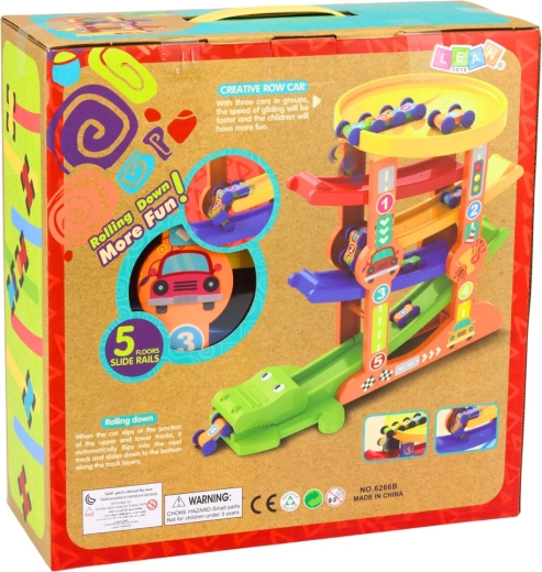Elke verdieping heeft een andere kleur en de autootjes zijn tweekleurig. Dankzij de nummering van de niveaus en de voertuigen oefenen kinderen gemakkelijk kleuren en de eerste cijfers. In de set zit ook een speciale “trein” van drie gekoppelde autootjes, die nog sneller naar beneden gaat en een aantrekkelijk effect in de bochten creëert.