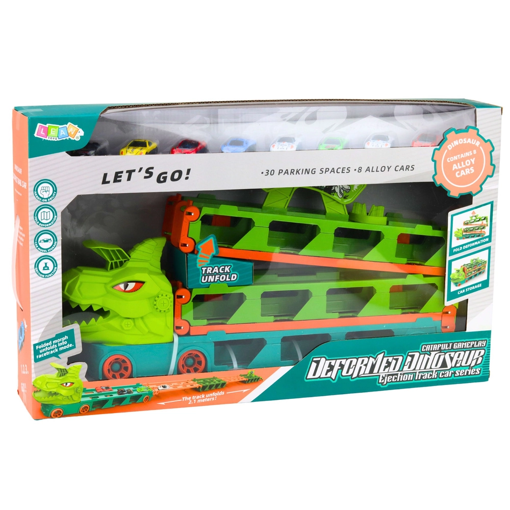 Een leuke set voor kleine racers en dinofans: een dinosaurustransporteur die verandert in een racebaan van 2,1 m, met 4-in-1 functies – transporter, racecircuit, garage en lanceerder. Inclusief 8 metalen autootjes, gelijktijdige start van twee voertuigen vanuit de T-Rex-kop en een praktisch handvat voor dragen voor spelen thuis en onderweg.