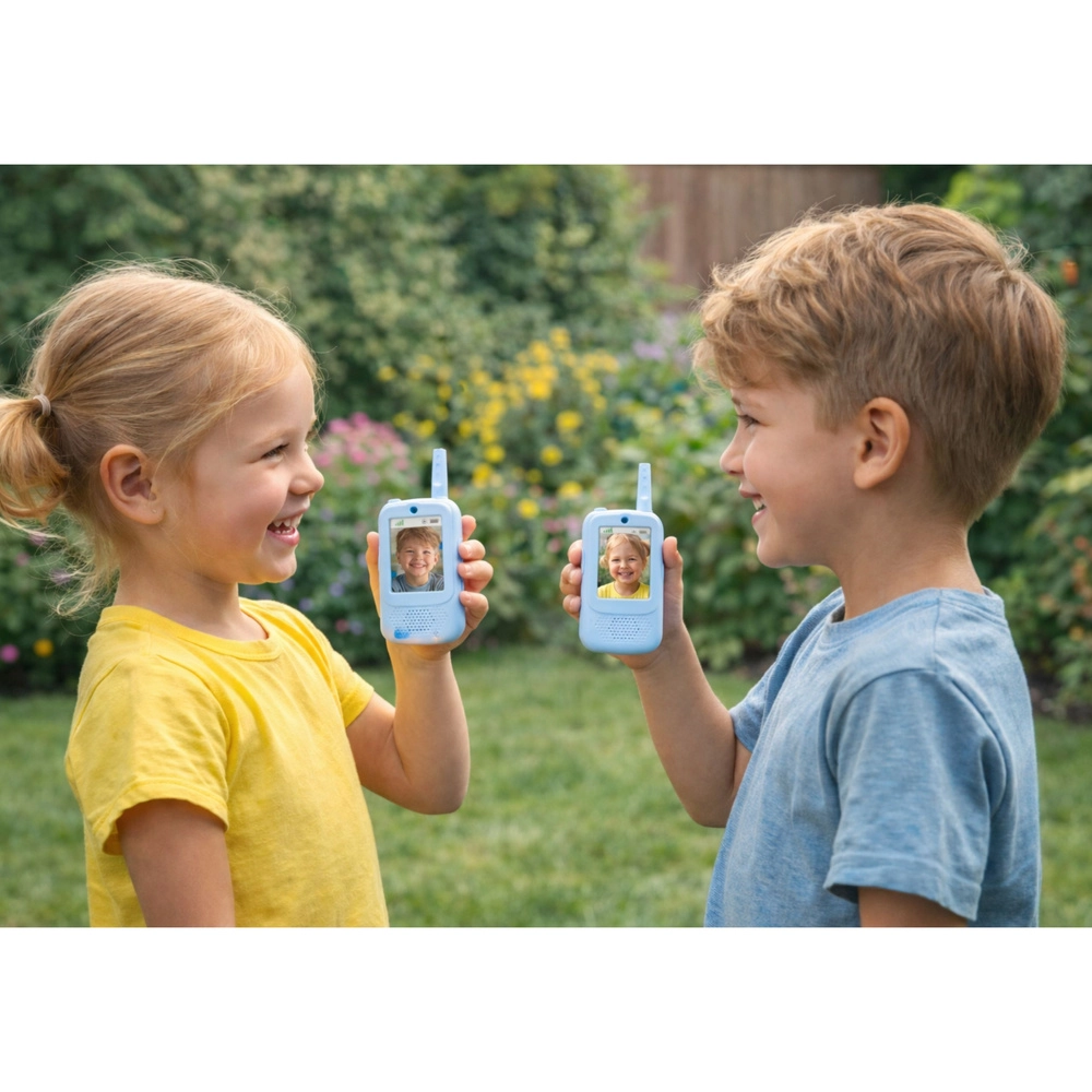 Geef kinderen leuke en veilige communicatie, thuis én buiten. Deze blauwe kinderwalkietalkies bieden niet alleen klassieke druk‑en‑praat (PTT) verbinding, maar ook videogesprekken op het ingebouwde display, foto's maken en video's opnemen. Het eenvoudige menu met taalkeuze maakt de bediening gemakkelijk, zelfs voor de allerkleinsten.