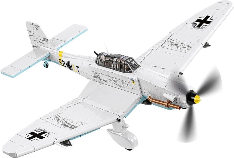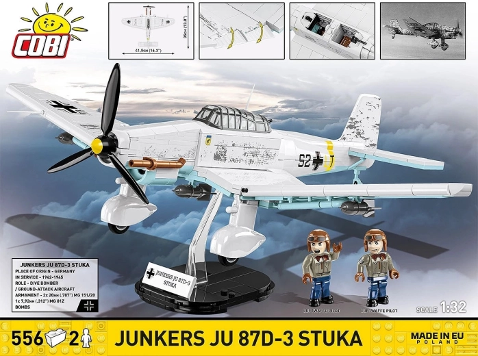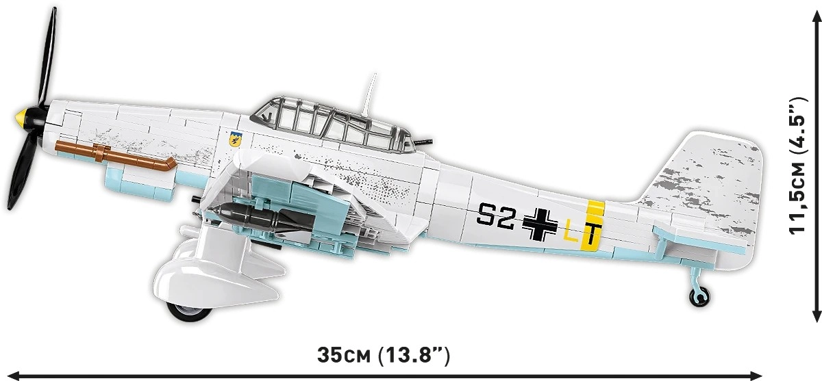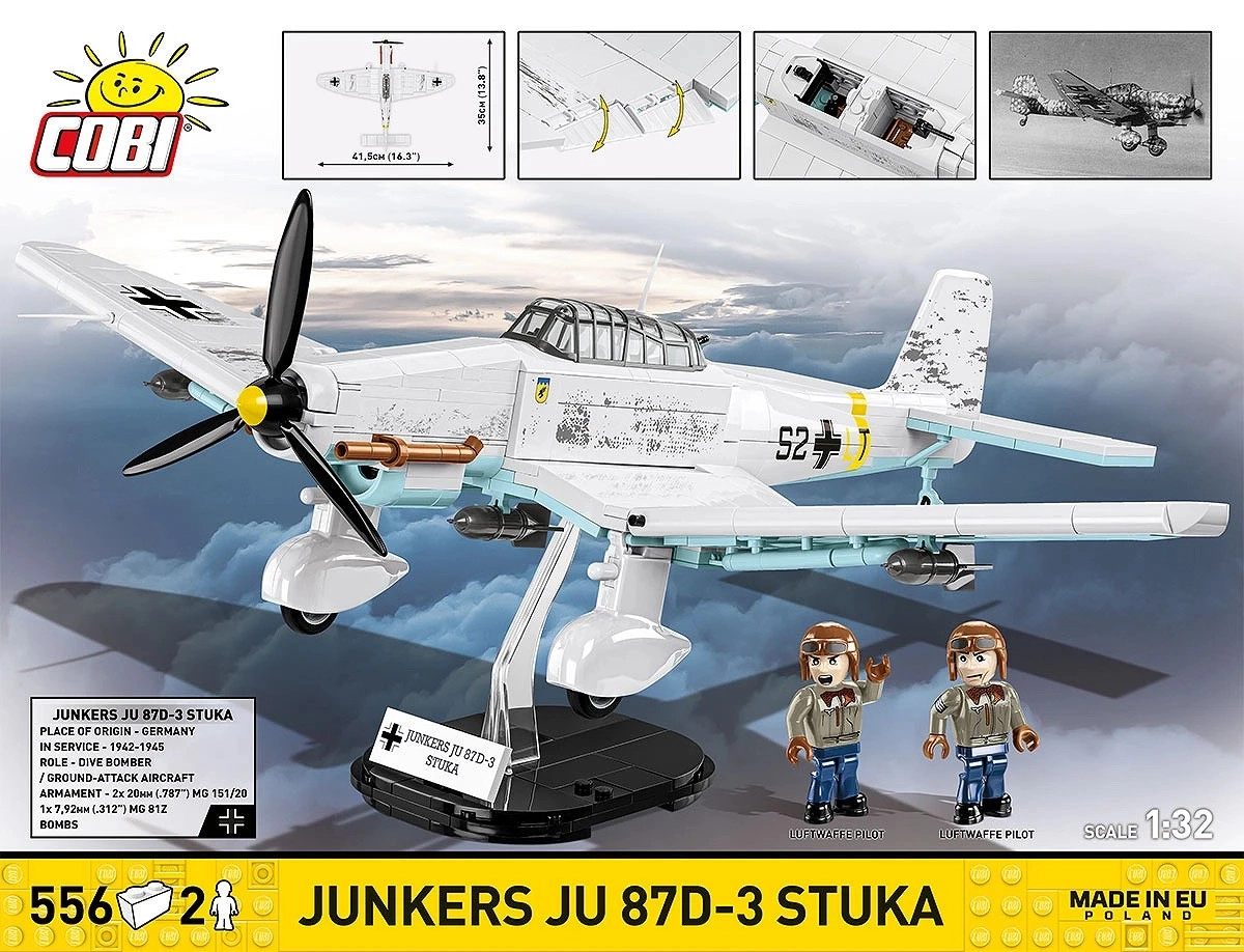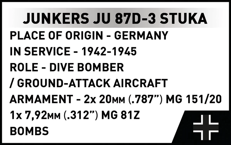 Bevat 2 minifiguren van de bemanning en een zwarte standaard met de naam “Junkers Ju 87D-3 Stuka” voor een aantrekkelijke presentatie van het model in vlucht.