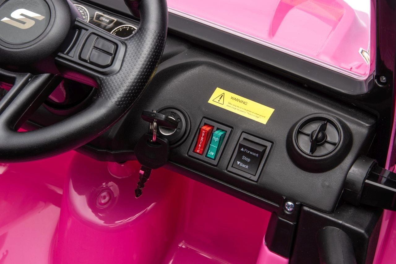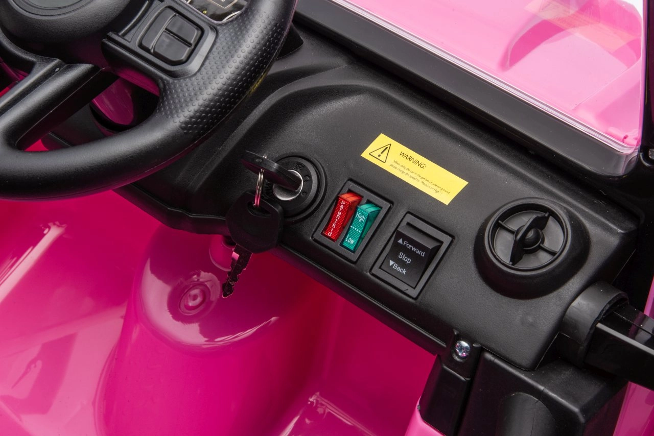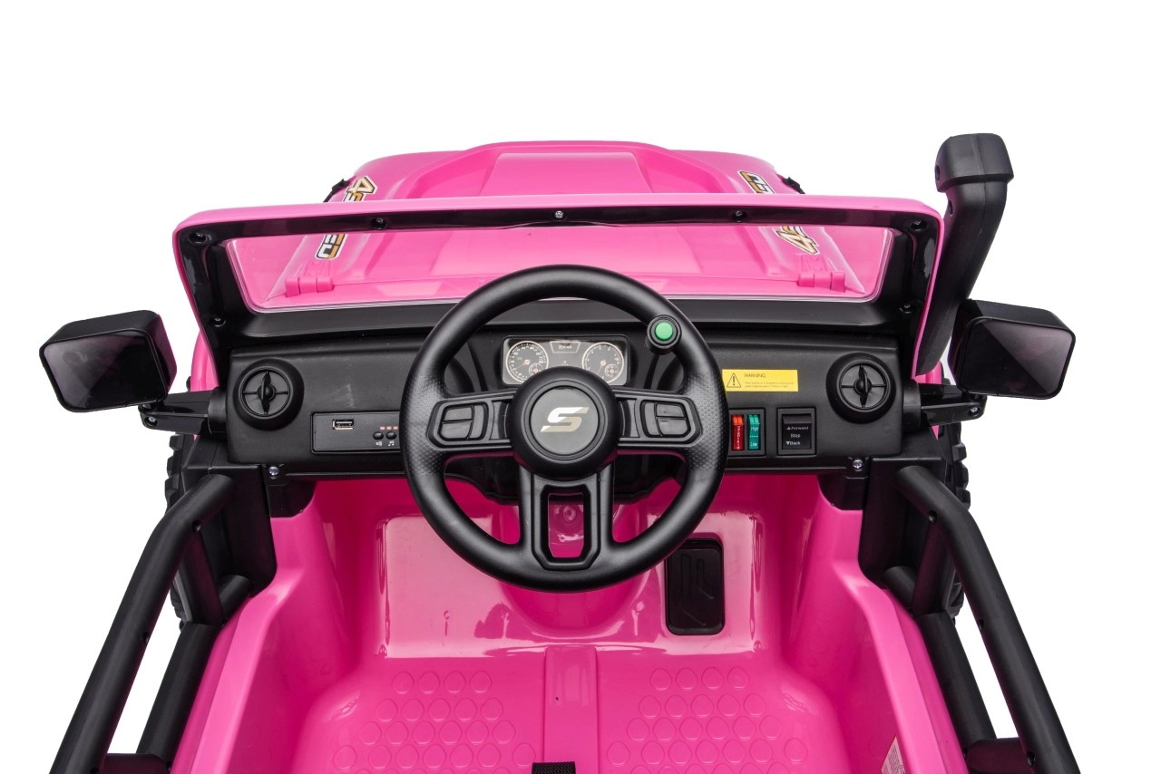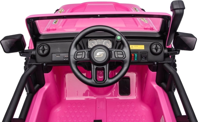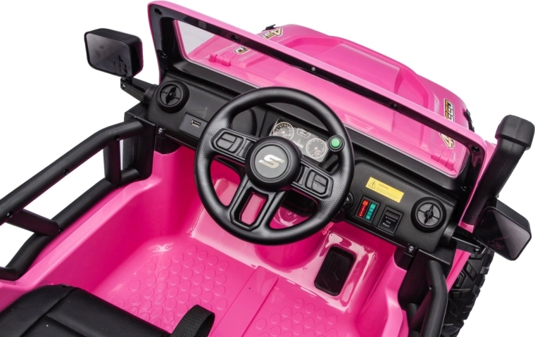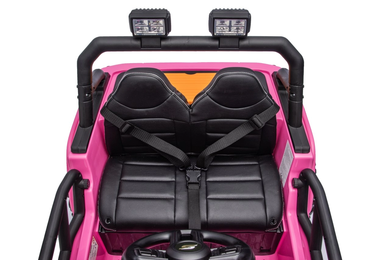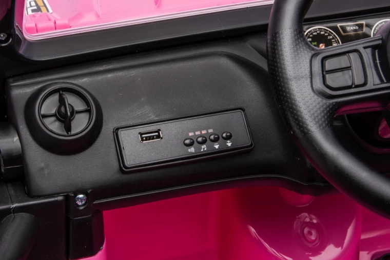 Ouders houden de rit volledig onder controle dankzij de 2,4 GHz afstandsbediening met 3 snelheden en de veiligheidsknop Stop. Kinderen waarderen de openende deuren, realistische LED-koplampen en de bovenste lichtbalk (op batterijen). De tweezits stoel van eco-leer met veiligheidsgordels verhoogt zowel comfort als veiligheid.
