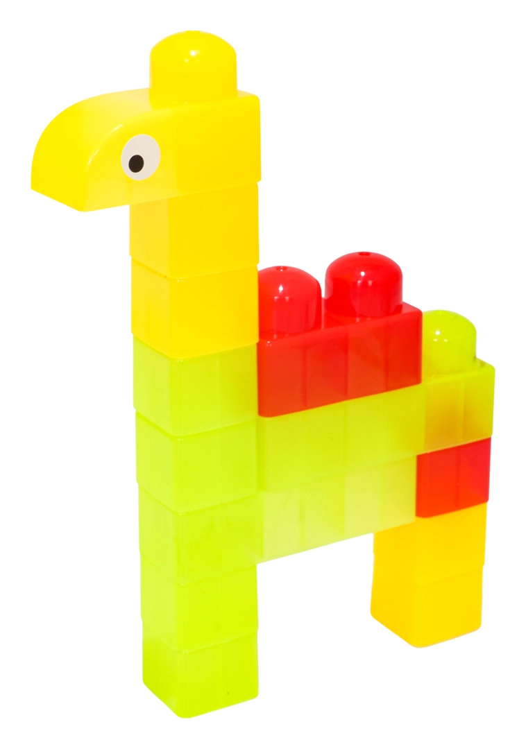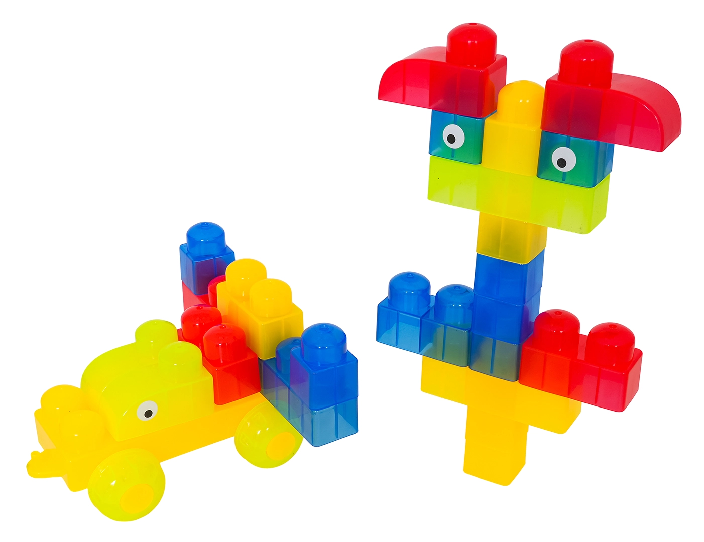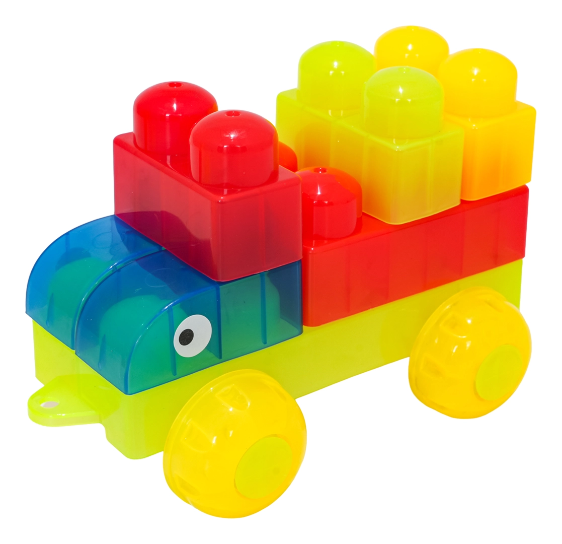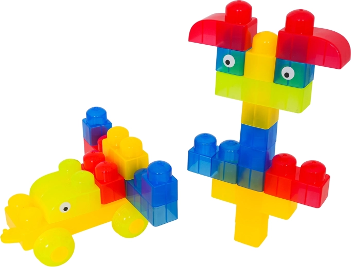 Dankzij de gevarieerde vormen (enkelvoudige, dubbele en drievoudige blokken, chassis met wielen en onderdelen met dakje) bouw je schattige diertjes, eenvoudige voertuigen en kleurrijke figuurtjes. Bijgevoegd zijn stickers met oogjes voor extra speelse expressie van de figuurtjes en een beeldhandleiding voor een snelle start. Bouwen verbetert de oog-handcoördinatie, fijne motoriek en stimuleert creatief spel.