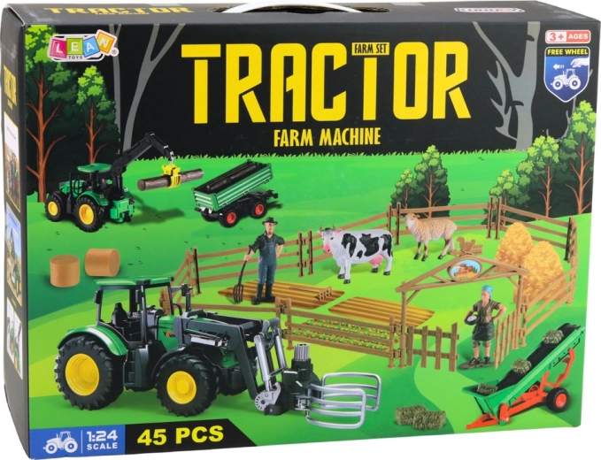 De set bevat een tractor met trekhaak, aanhanger, transportband, hekwerken met poorten, figuren van boeren en dieren, plus allerlei gereedschap en accessoires. Het spel bevordert fijne motoriek, verbeeldingskracht en rollenspel-vaardigheden.