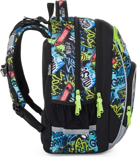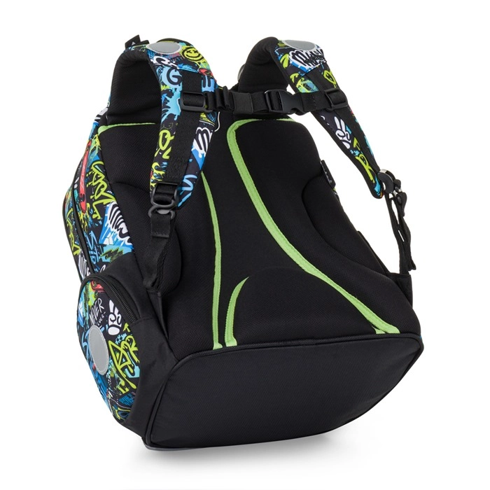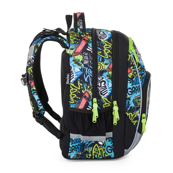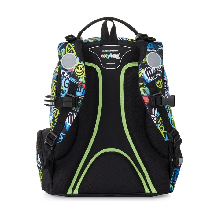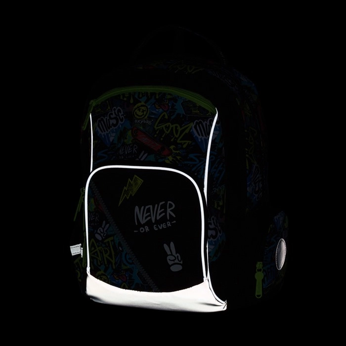 De Oxybag OXY GO Funny Boy schoolrugzak in moderne graffitistijl is ontworpen voor kinderen vanaf ca. 125 cm (groep 3–5 / 1e–3e klas). Dankzij de anatomisch gevormde, ademende rug en verstelbare schouderbanden biedt hij de hele dag door comfort en correcte rugondersteuning. De stevige, waterdichte bodem zorgt voor weerstand tegen water en vuil, zodat de inhoud veilig blijft.