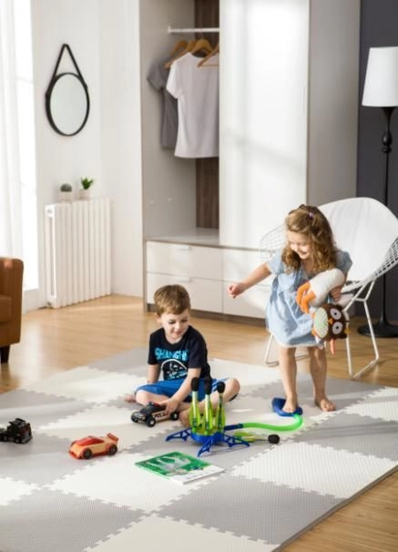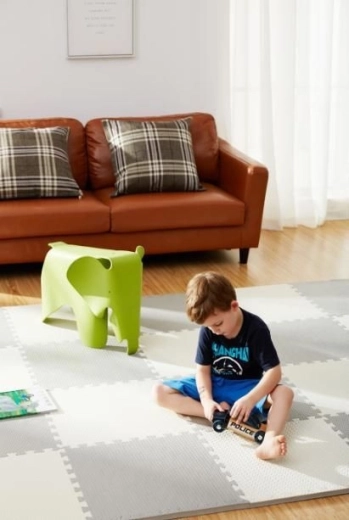 Eenvoudig onderhoud en modulair ontwerp – tegels van 60 × 60 cm met hoekstrips bouw je snel tot een kleed passend bij de ruimte. Het waterdichte oppervlak is met een vochtige doek zo schoon te maken. Tegels kunnen aan extra sets van hetzelfde model worden gekoppeld voor een grotere speelzone of tot 3D-vormen worden opgebouwd ter bevordering van creativiteit.