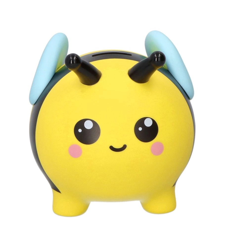 De vriendelijke bij met blauwe vleugeltjes en blosjes maakt de eerste stapjes in financiële geletterdheid leuk en fleurt elke kinderkamer op.