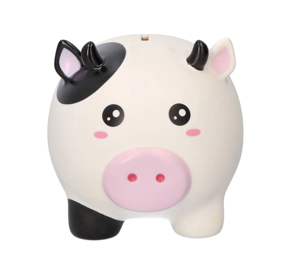 De koe met zwart-witte vlekken en een roze snoet maakt sparen leuk – ideaal voor de kinderkamer en als cadeautip.