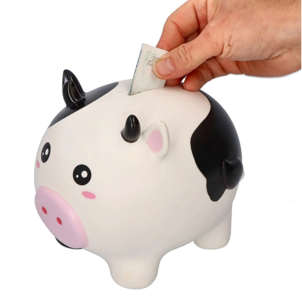 Deze grote spaarpot in de vorm van een koe valt meteen op door het lieve design met zwart-witte vlekken en een roze snoet. De brede opening bovenaan maakt het eenvoudig om zowel munten als bankbiljetten in te werpen, waardoor sparen leuk is voor jong en oud.