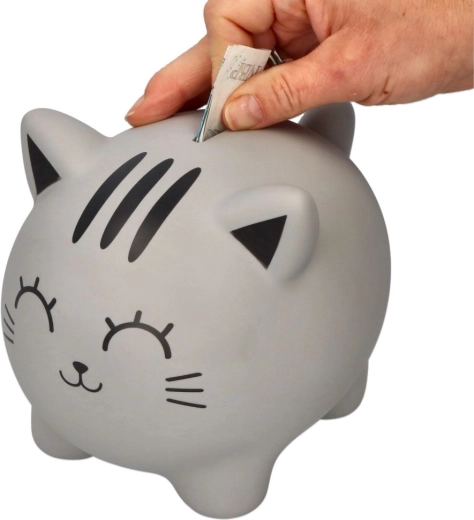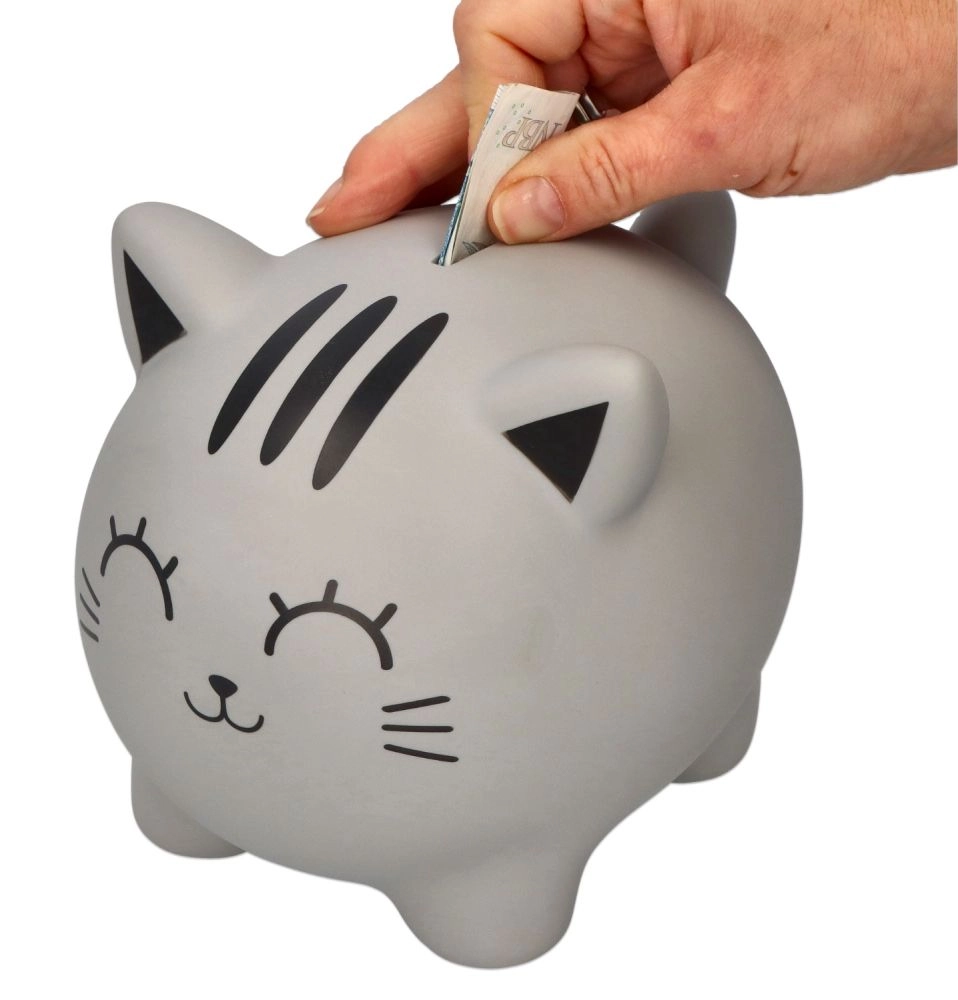- Design van een grijze kat – een sympathieke look die motiveert om te sparen.