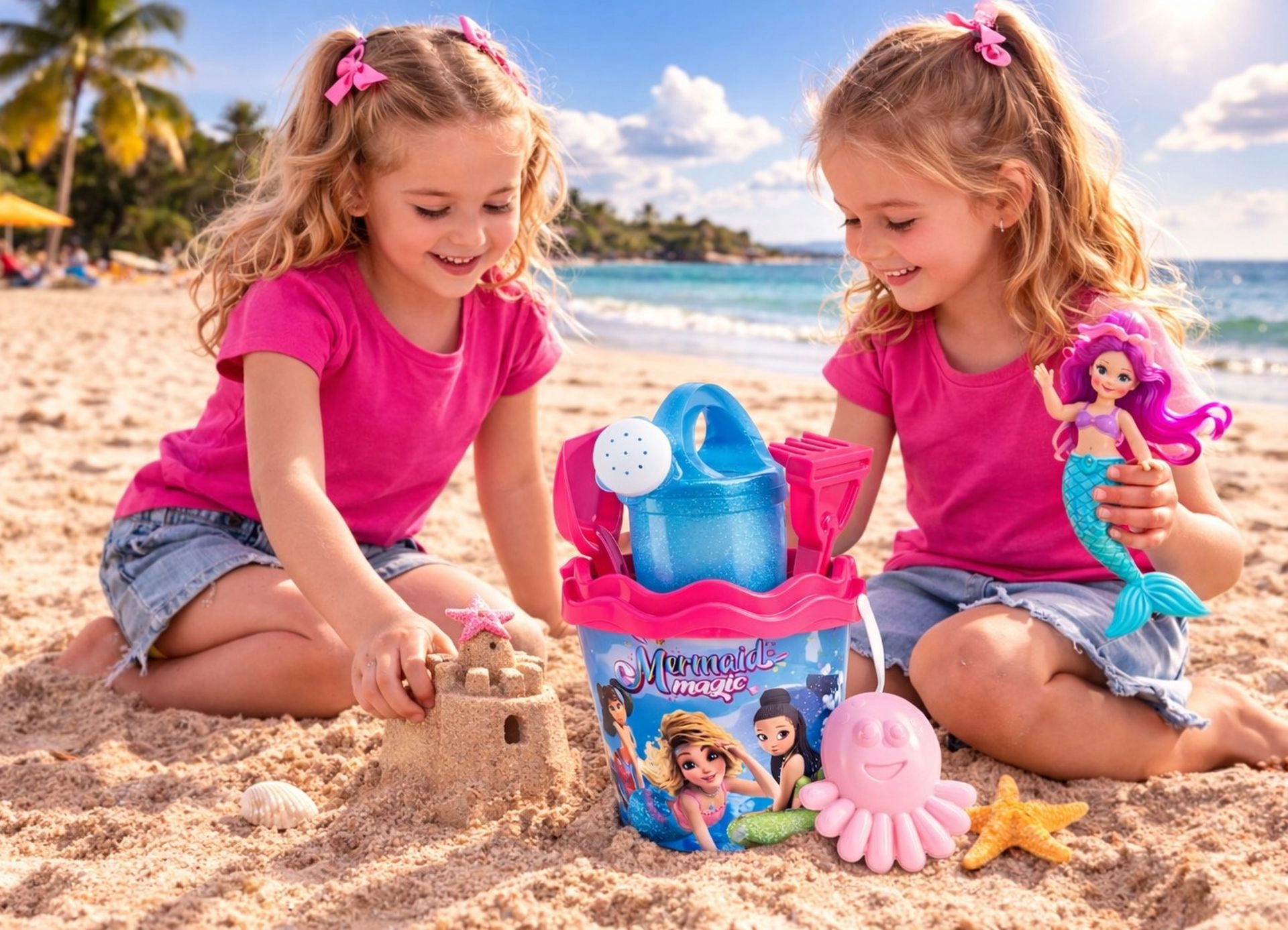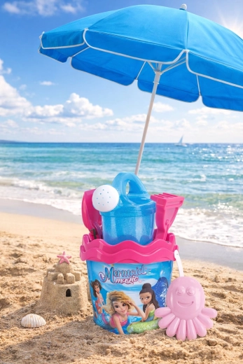 De praktische emmer (diameter 17 cm, hoogte 16 cm) wordt aangevuld met een glinsterende gieter van 0,5 l, een zeef, schep, hark en een vormpje in de vorm van een octopus. De volledige set heeft een hoogte van 32 cm en weegt slechts 0,314 kg, zodat je ze comfortabel meeneemt naar strand en speeltuin.