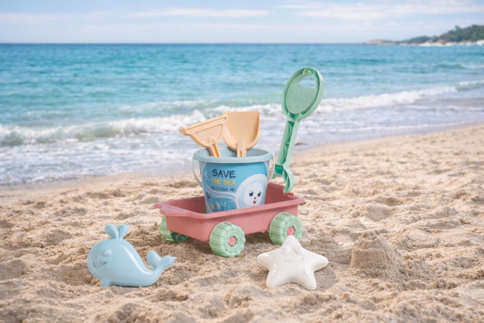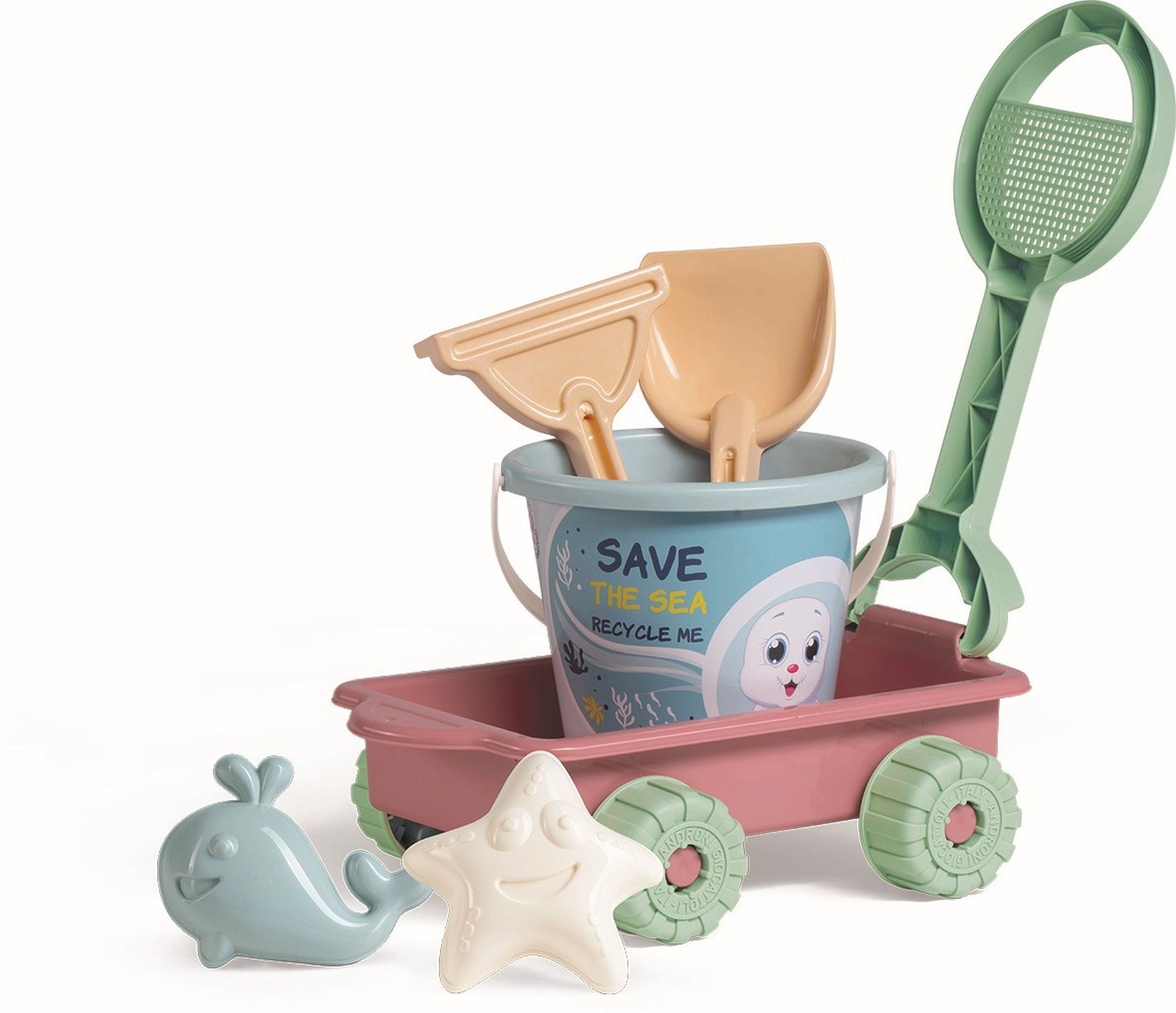 - Wagentje met handvat en zeef, emmer, schepje, harkje, vormpje vis, vormpje zeester