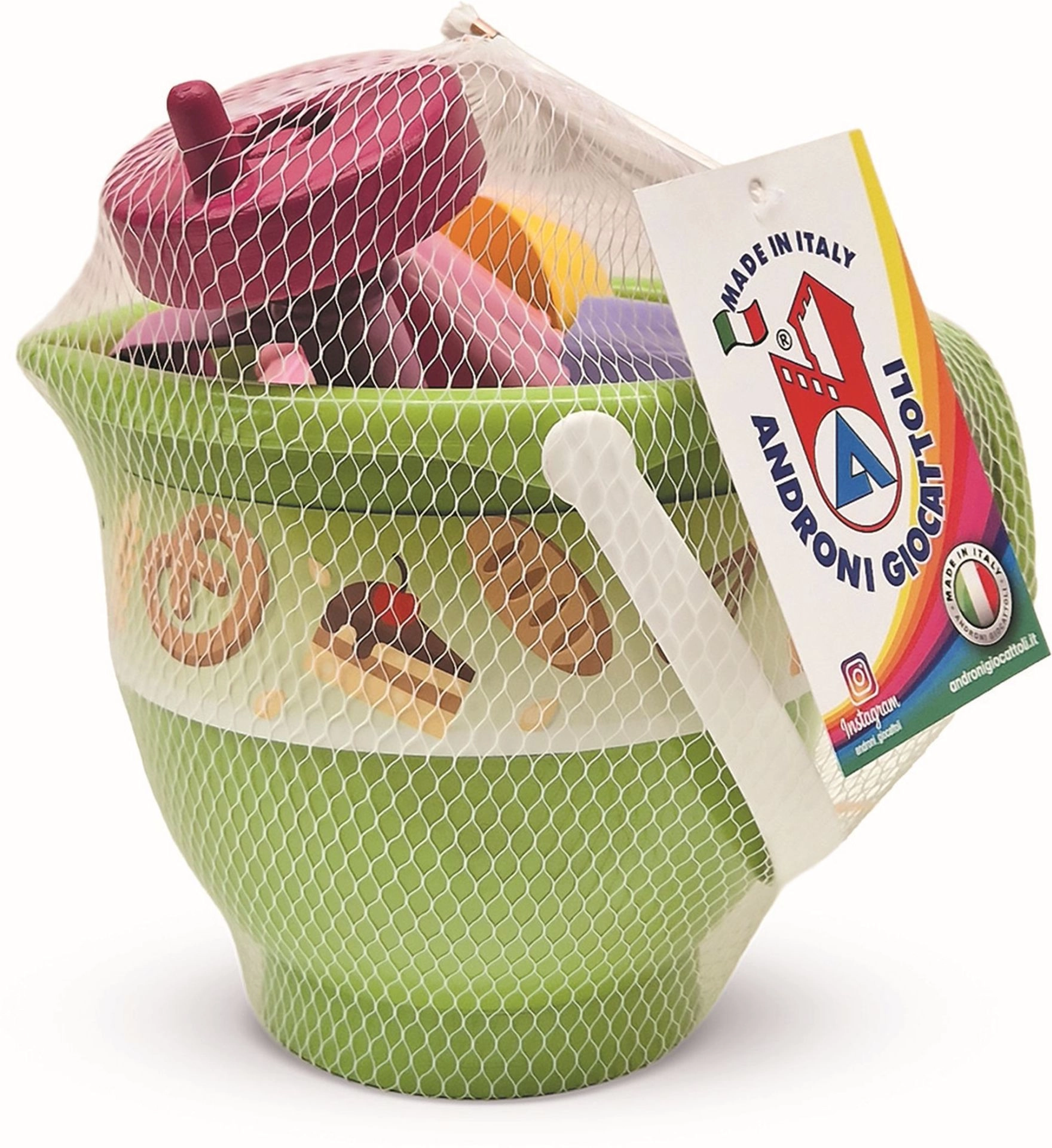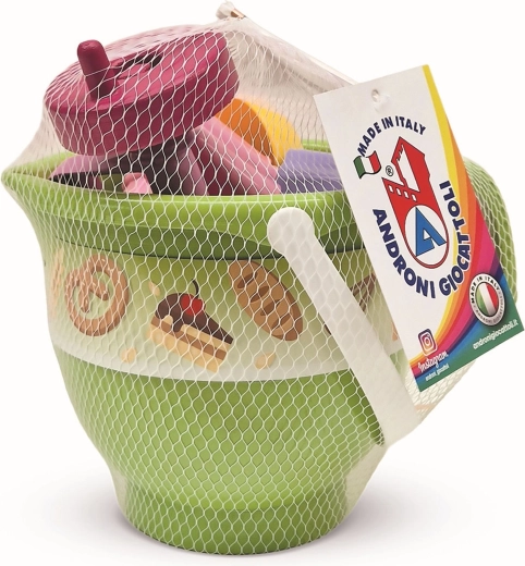 Een leuke en veilige set voor kleine bakkers in de zandbak. Deze 6-delige ANDRONI-set van hoogwaardig Italiaans plastic biedt een emmer in de vorm van een kom, vormpjes voor tulband en taartje, een ijsbollepel en een handklopper. Licht, duurzaam en ideaal voor de ontwikkeling van fantasie en fijne motoriek, al vanaf 10 maanden.