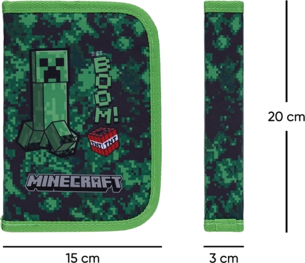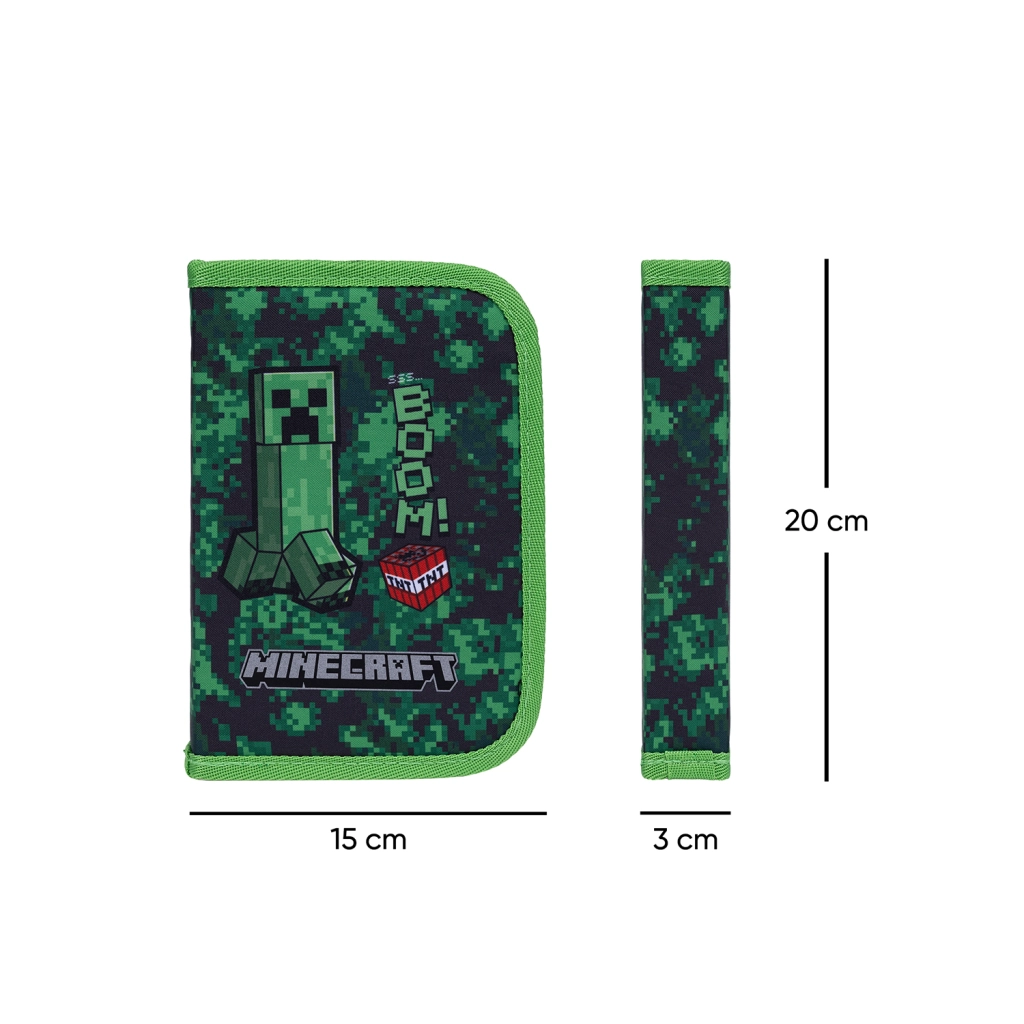 Stijlvolle schooletui met MINECRAFT Boom-motief biedt een praktische eenlaagse uitvoering met twee flappen, een duurzame YKK-rits en een overzichtelijke indeling. Binnenin vind je een vakje voor kleinigheden, een venstertje voor het lesrooster en stevige elastieken die ook compatibel zijn met driehoekige kleurpotloden en viltstiften. De etui wordt zonder vulling geleverd en is gemaakt van gerecycled materiaal.