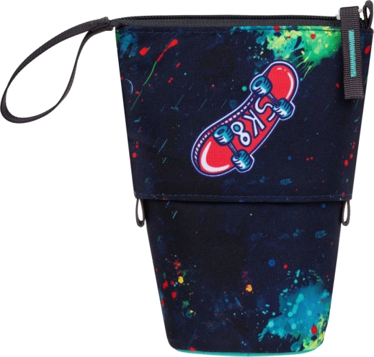 Ontdek een doordachte etui die in een oogwenk verandert in een overzichtelijke pennenhouder. Dankzij het stevige en waterbestendige materiaal behoudt hij zijn vorm, beschermt hij potloden en stiften en zorgt hij voor eenvoudige organisatie voor zowel kinderen als ouders. Het moderne design met de patch “CHILL OUT” en kleurrijke “splatters” geeft elke schoolbank extra stijl.